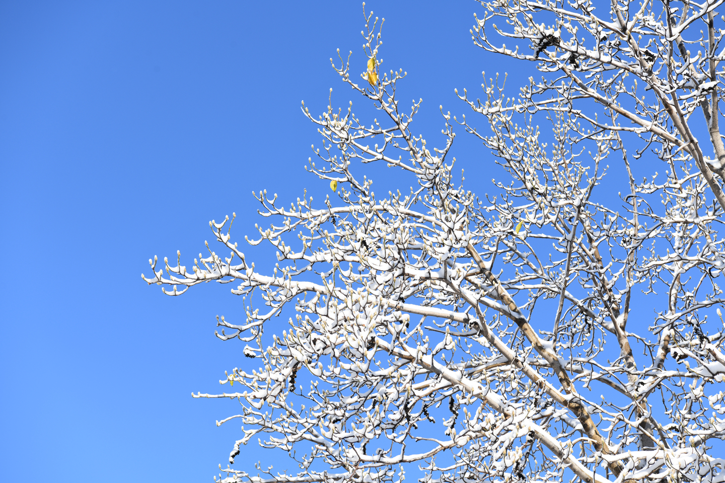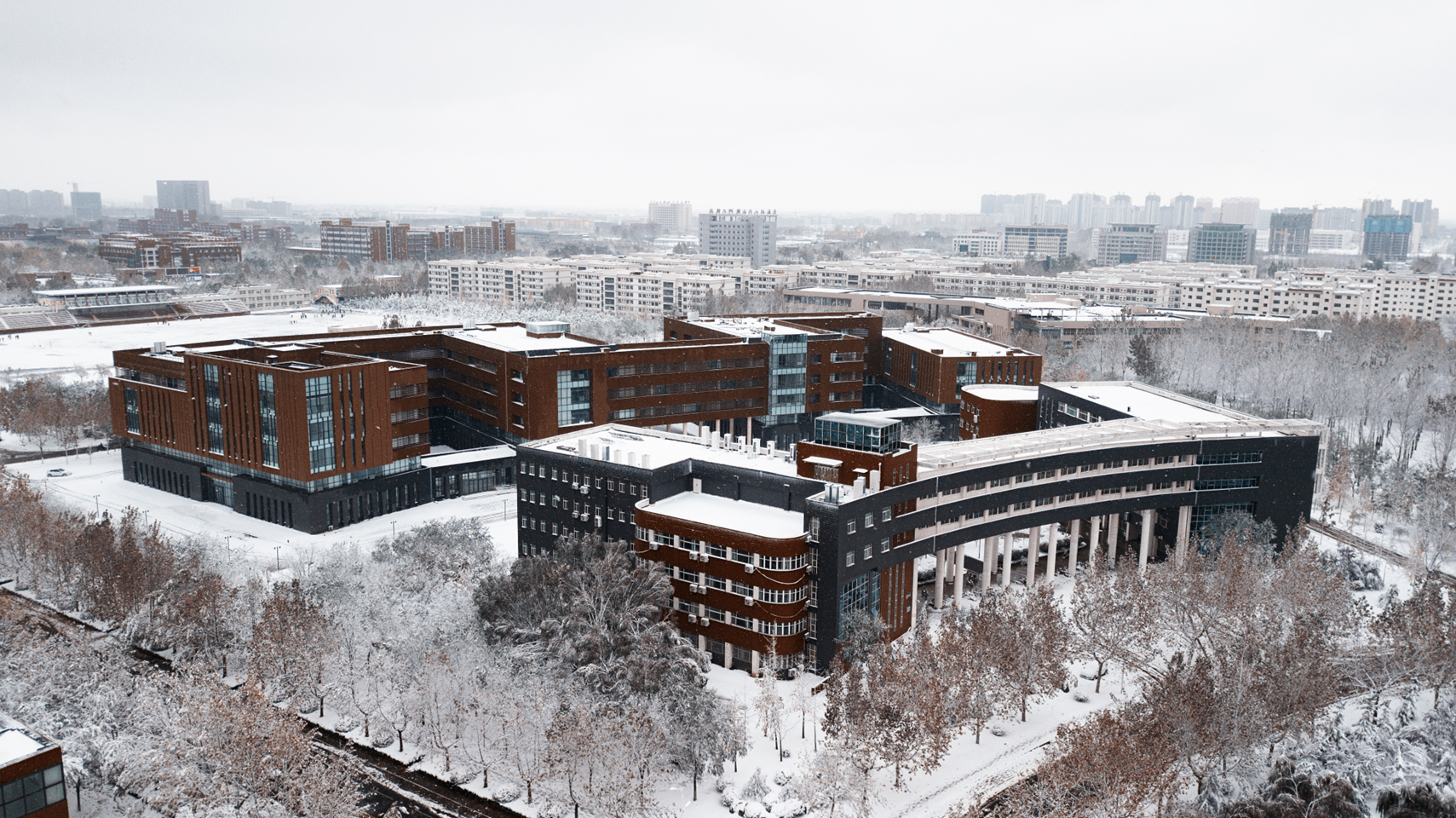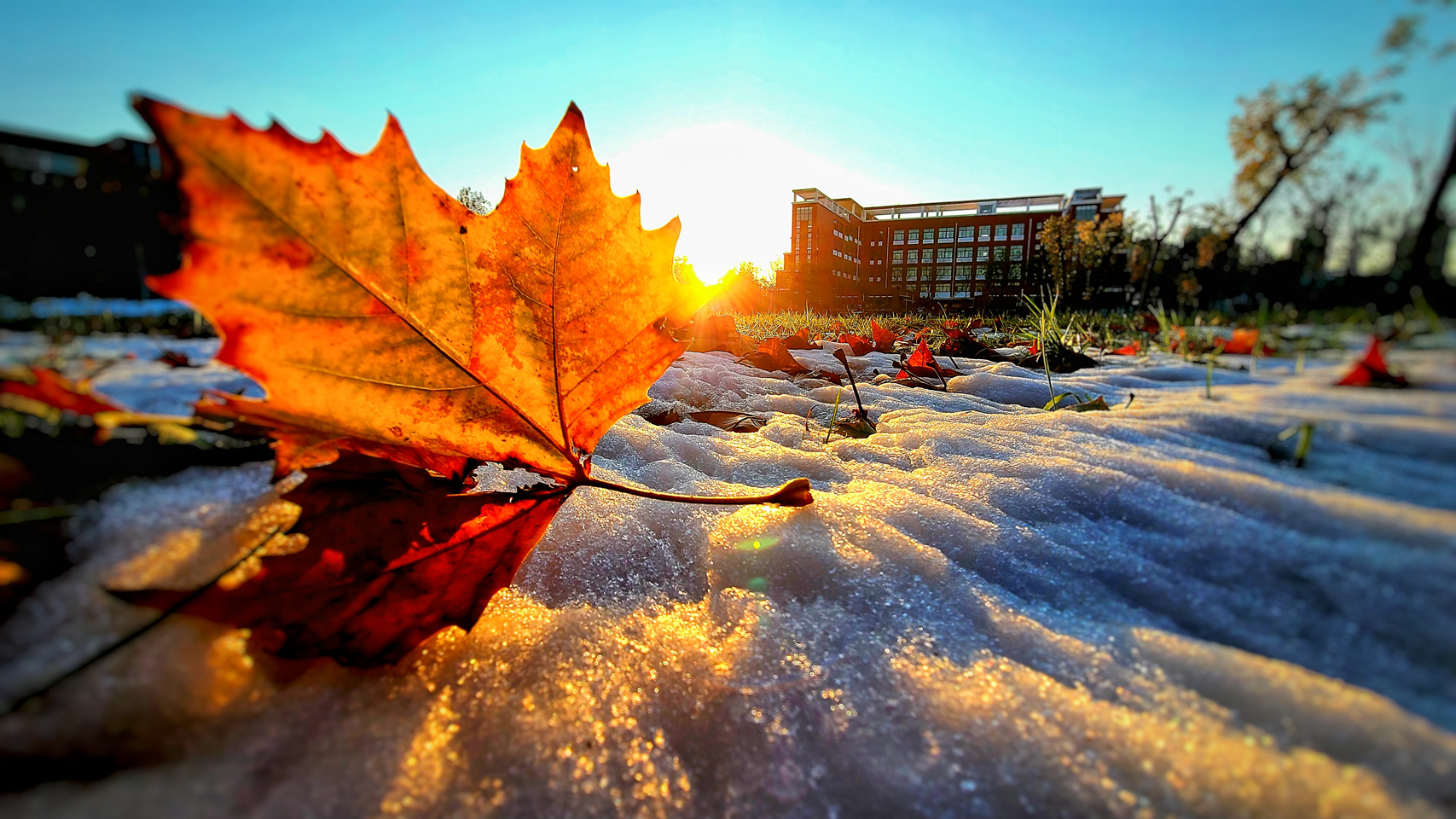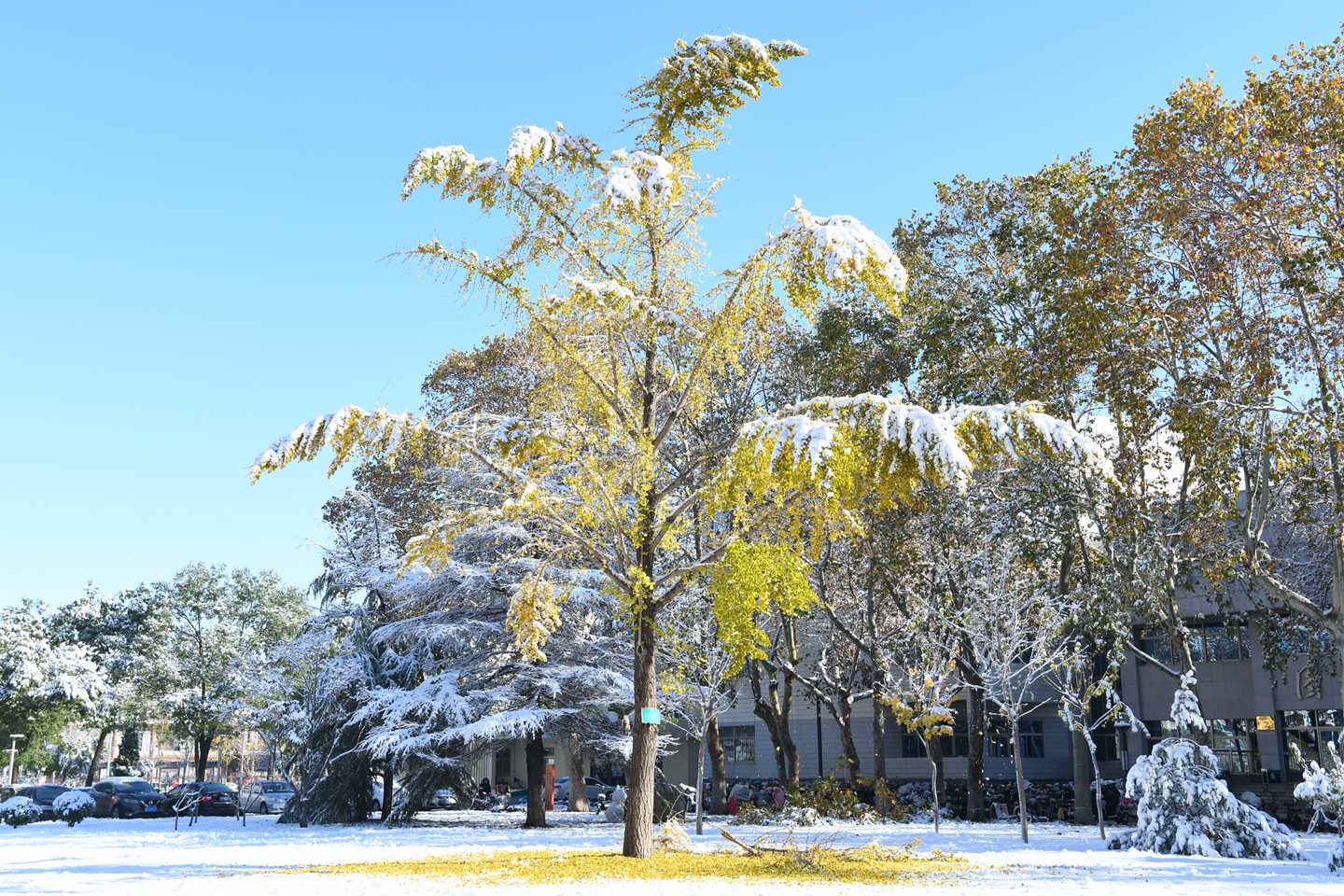 立冬之际,雪花纷纷飘落。这些冬之精灵亲吻着大地,与枝头的红果黄叶嬉戏,为高楼大树穿上新衣……校园里银装素裹,玉树琼枝,俨然一个童话世界。