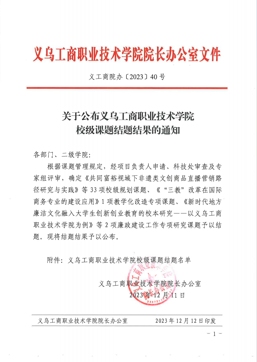 义工商院办〔2023〕40号定稿:关于公布2023年下半年义乌工商职业技术学院校级课题结题结果的通知.pdf
