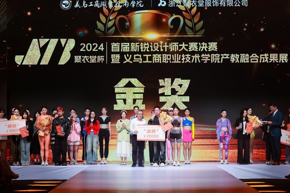 色彩鲜亮明快的糖果运动服、采用“黑科技”实用新型面料的专业瑜伽服、融合传统文化元素的新国潮产品、跨界互动的联名创意……4月12日,在首届“聚衣堂杯”轻运动瑜伽服新锐设计师大赛决赛暨义乌工商职业技术学院产教融合成果展的“无界”秀场T台上,户外运动、多巴胺、功能性、奶茶联名等四个主题的百余套设计作品轮番登台,在专业模特的演绎下,让现场的商业“燃点”和人气“燃点”爆棚。