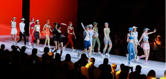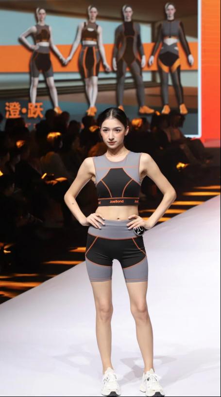 色彩鲜亮明快的糖果运动服、采用“黑科技”实用新型面料的专业瑜伽服、融合传统文化元素的新国潮产品、跨界互动的联名创意……在以“无界”为主题的秀场T台上,户外运动、多巴胺、功能性、奶茶联名等四个主题的百余套设计作品轮番登台。在专业模特的演绎下,让现场的人气“燃点”爆棚。