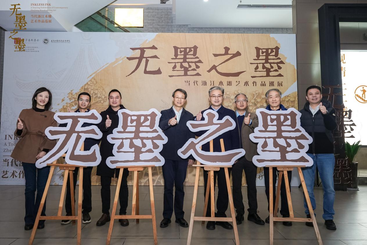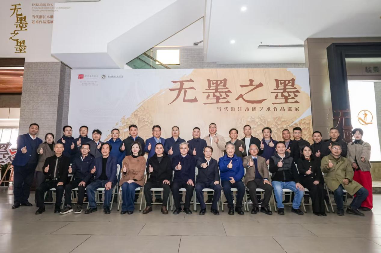 作为巡展继北京、合肥、上海后的第四站,杭州站吸引了艺术界、教育界及文化领域众多领导与嘉宾齐聚运河畔。开幕式上,义乌工商职业技术学院党委书记李昌祖、浙江艺术职业学院党委书记薛亮、浙江省文联创研处处长郑斯奇、杭州工艺美术博物馆馆长陈刚、中共金华市委宣传部副部长陈晓峰、杭州工艺美术博物馆副馆长吕昂、义乌工商职业技术学院副院长盛湘君、项目策展人清华大学美术学院教授王建中、浙江省民间文艺家协会副主席兼秘书长徐新、中国美院雕塑系主任钱云可、义乌工商职业技术学院澳门网投官方网站负责人、亚太手工艺大师高公博、浙江省工艺美术行业协会会长徐伟军、中国工艺美术大师李凤荣,以及13位浙江省工艺美术大师代表共同出席。上午9时,李昌祖、薛亮、陈刚、陈晓峰、郑斯奇、王建中、徐新、徐伟军共同为杭州站展览揭幕,标志着这场国家艺术基金资助项目“无墨之墨:当代浙江木雕艺术作品巡展”正式落地杭州。