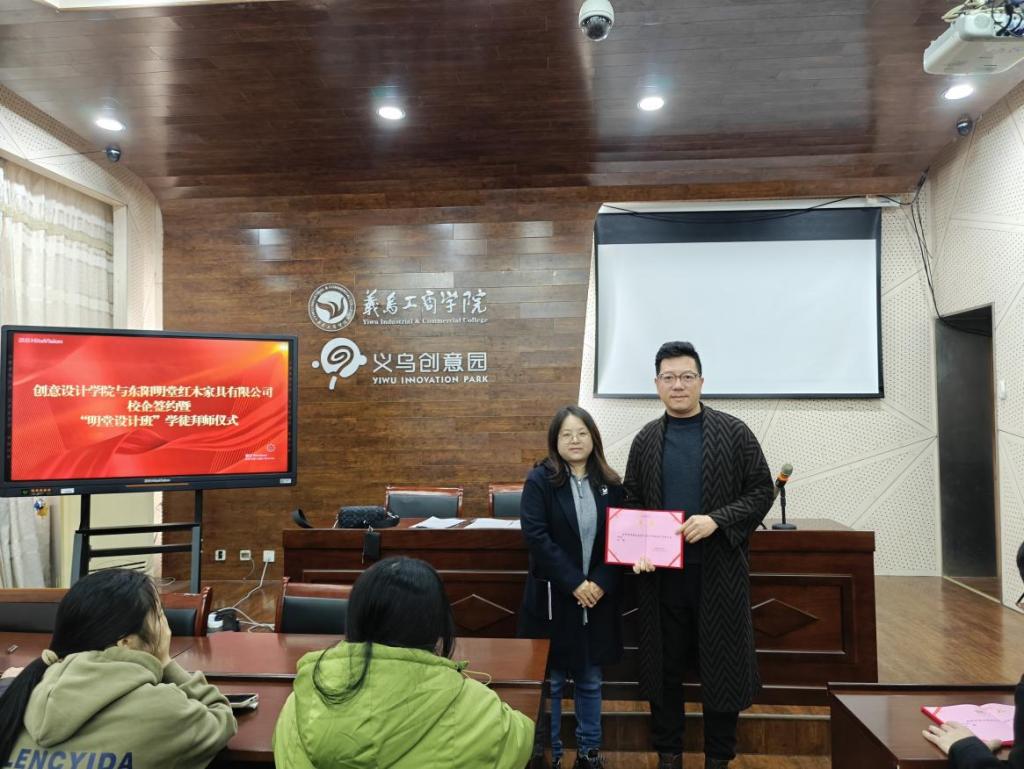 学院教学负责人与东阳明堂红木家具有限公司副总经理作为校企双方代表在会上签订合作协议并合影。随后,学院教学负责人向四位企业导师颁发产业导师聘书。她对学徒班学生提出殷殷期待,希望明堂学徒班的同学在企业导师带领下专业技能更上一层楼。并指出,通过深化产教融合,充分发挥企业学校双主体育人作用,形成可推广的实施内容、路径及典型经验,带动学徒制向高质量高层次发展。厉飞进代表企业对同学们加入明堂设计班表示诚挚欢迎,并鼓励各位学子投入、拥抱“美学时代”,体验美、创造美、传递美,学以致用,实现成长