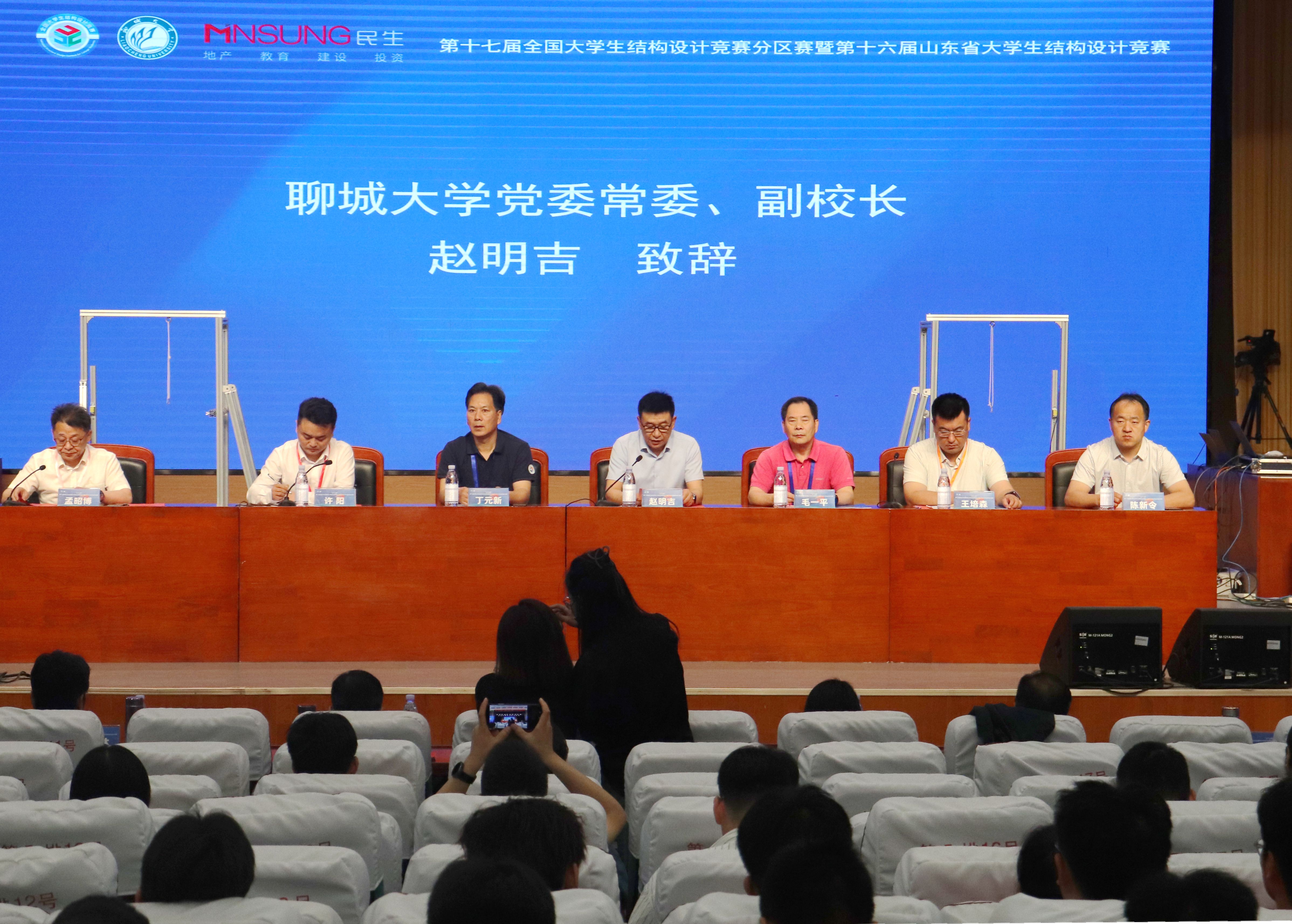 全国大学生结构设计竞赛委员会副秘书长毛一平、丁元新,山东省大学生结构设计竞赛委员会秘书长王培森,beat365官方网站党委常委、副校长赵明吉,beat365土木工程专业2009级校友、民生阳光集团董事、山东民兴建筑工程有限公司总经理许阳出席开幕式。学校相关职能部门负责人、有关专业师生代表和来自山东大学、中国石油大学(华东)、哈尔滨工业大学(威海)等省内30所高校的61支参赛队伍共计300余人参加活动。开(闭)幕式由建筑工程学院院长孟昭博主持。