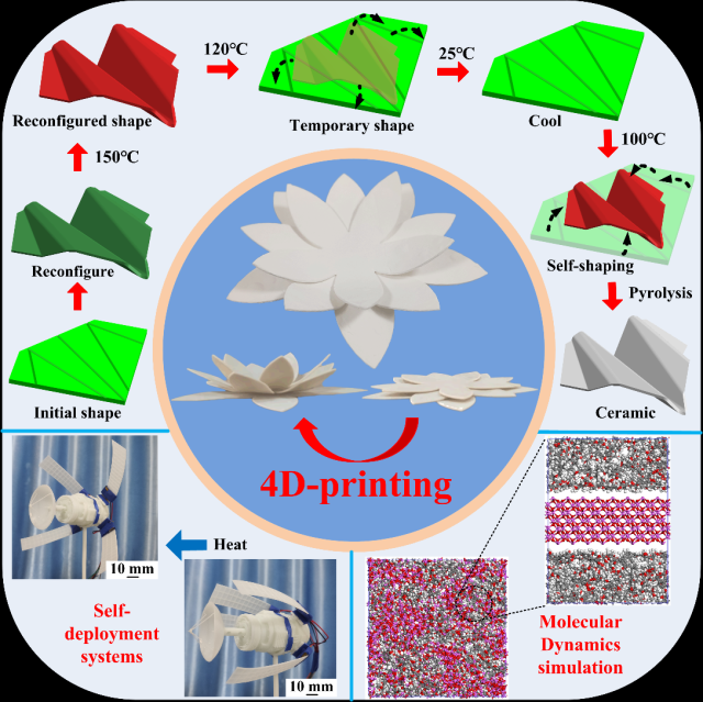 聚合物衍生陶瓷(PDCs)由于其高热稳定性、抗氧化性和耐腐蚀性,在制造复杂形状的陶瓷零件方面受到了广泛的关注。虽然柔性PDCs提供结构重构,但诱导形状变化的方法主要依赖于机械负载,如手动加载、电机或气动泵,这被认为是不切实际的,并且需要复杂的控制系统。为了解决这些问题,团队首次提出并开发了一种基于还原光聚合(VPP)的四维(4D)打印方法,以制造具有可重构和形状记忆效应的PDCs。这种创新的4D打印方法是高度可编程的,并与VPP技术兼容,允许制造高分辨率,复杂设计的陶瓷结构。通过两步固化工艺,成功地实现了聚合物衍生陶瓷前驱体(PDCPs)的自主形状转变。采用有限元建模和分子动力学模拟相结合的方法对形状变化进行预测和控制。基于所提出的方法,成功地制造了自展开系统(如空间站太阳能电池板的智能铰链),证明了PDCPs在智能制造、航空航天、生物医学等领域的潜在应用。