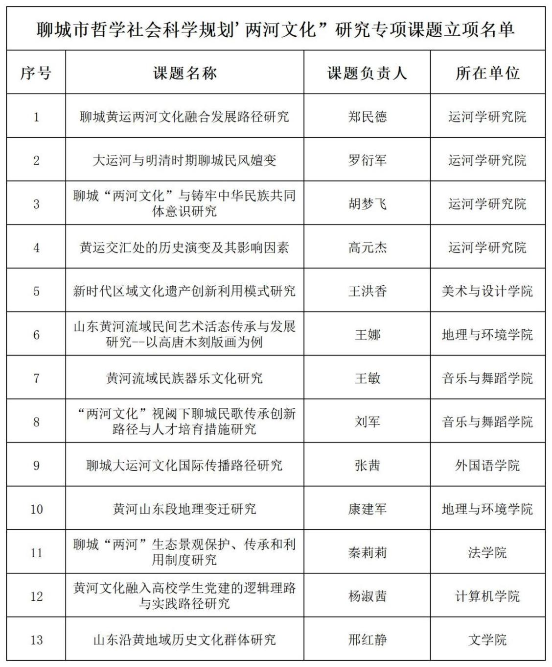 近日,聊城市哲学社会科学研究规划领导小组办公室发布了“两河文化”研究专项课题的立项公告,beat36513项课题予以立项,其中:运河学研究院获批4项,音乐与舞蹈学院、地理与环境学院各获批2项,美术与设计学院、外国语学院、法学院、计算机学院、文学院各1项。
