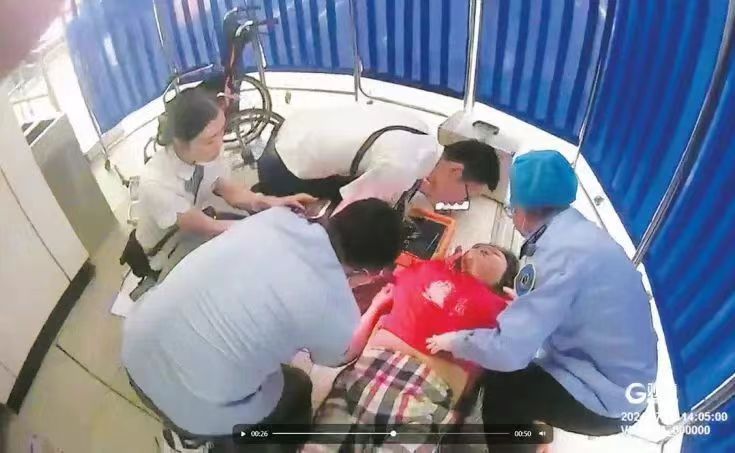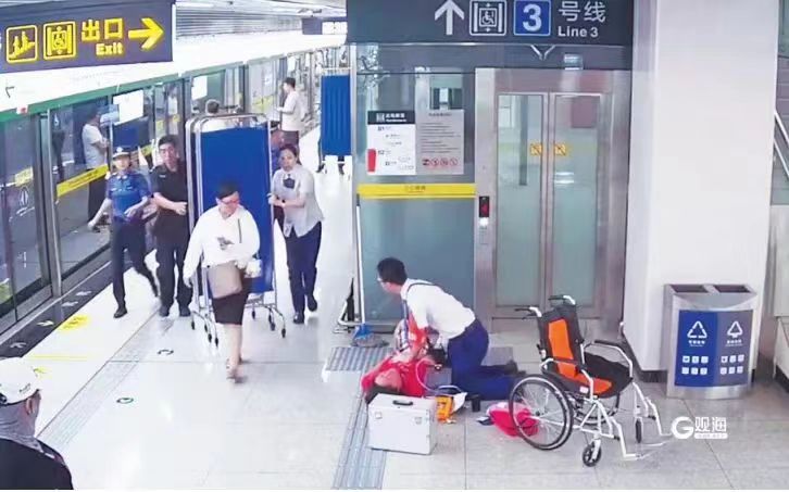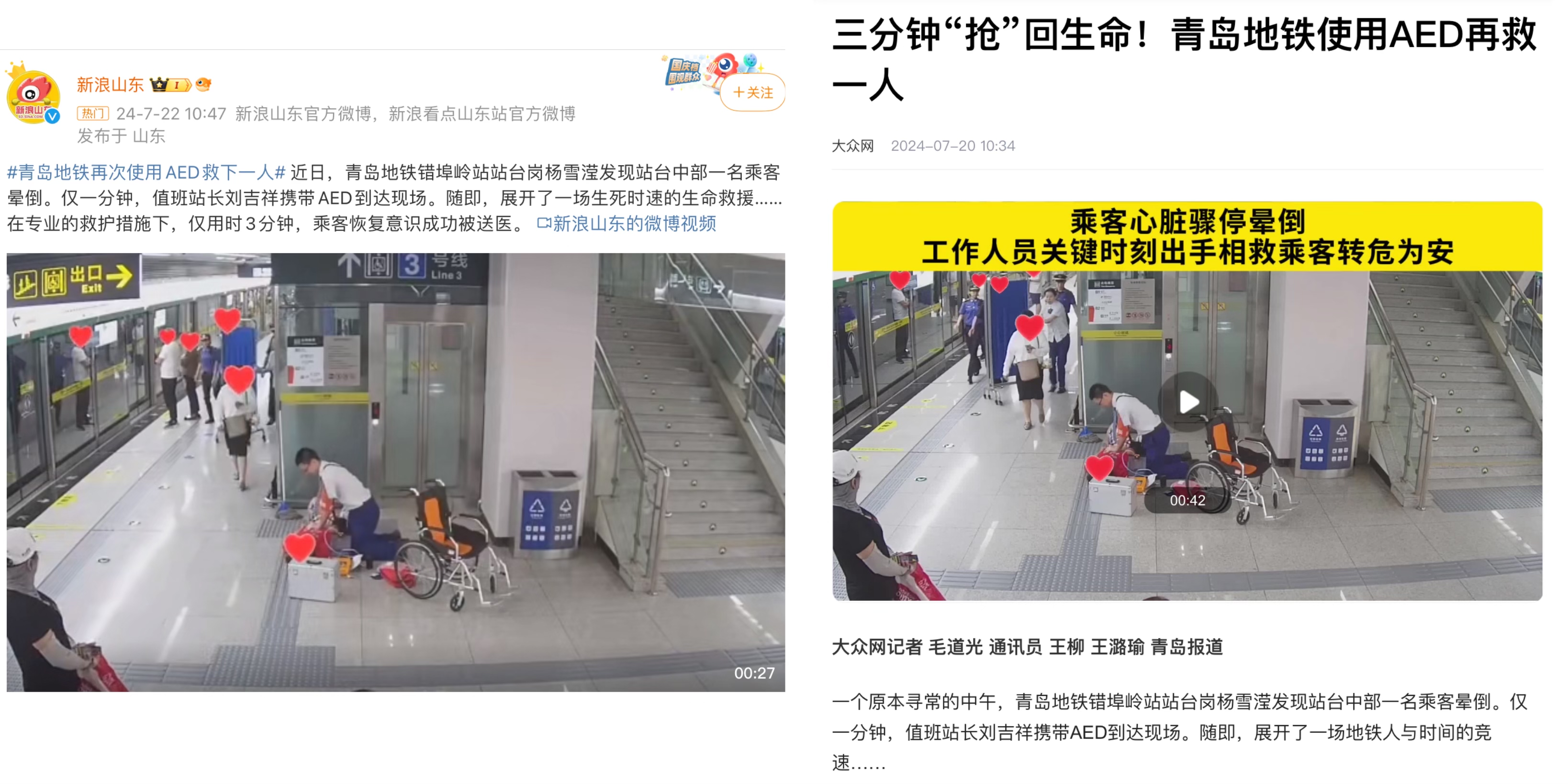 7月14日,在青岛地铁错埠岭站的站台上,一名乘客因突发疾病心脏骤停、倒地不起。值班站长刘吉祥接到呼叫后立即赶到现场,一边通知车站控制室拨打“120”,一边对乘客实施AED胸外按压。一分钟后,乘客口中发出微弱的叹息,并缓慢地睁开了双眼,恢复意识。医护人员随后到达现场,检查确认乘客已恢复心跳呼吸后送医治疗。
