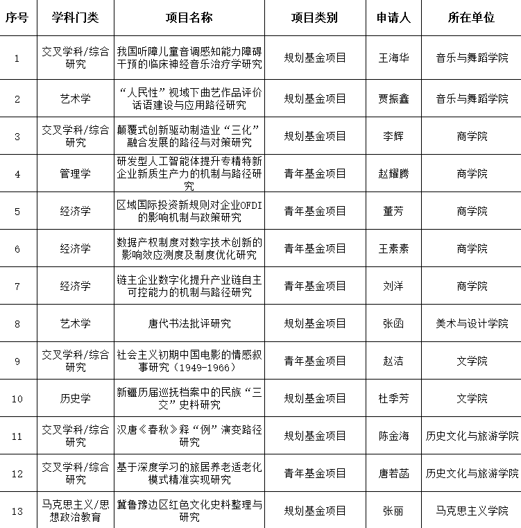 其中,规划基金项目7项、青年基金项目6项,商学院获批5项、音乐与舞蹈学院获批2项、文学院获批2项、历史文化与旅游学院获批2项、美术与设计学院获批1项、马克思主义学院获批1项。