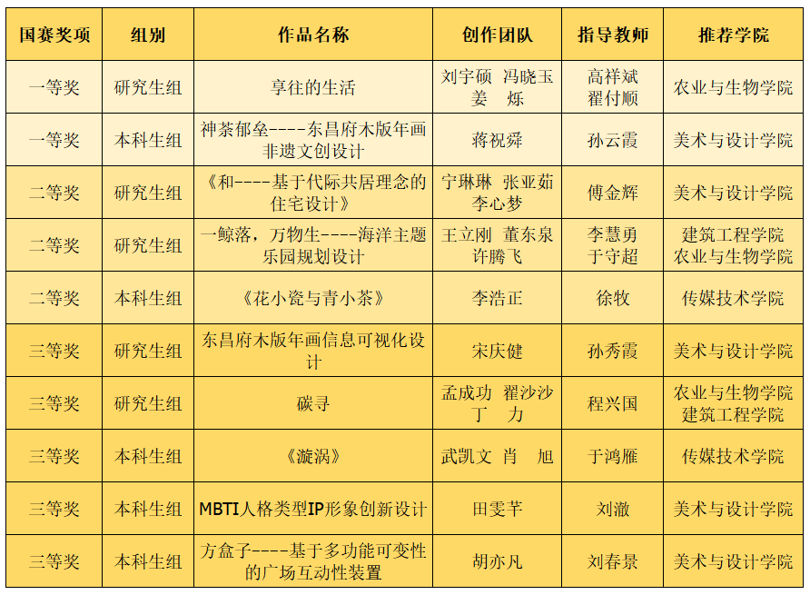 大赛校赛由创新创业学院主办,农业与生物学院承办。自大赛启动以来,同学们报名踊跃,经过校级赛-资格赛-省级初赛-省级决赛-全国总决赛等多轮竞赛,分别产生省级赛和全国赛获奖作品。来自美术与设计学院、传媒技术学院、建筑工程学院、农业与生物学院的10件作品经过层层选拔,最终荣获国赛奖励。