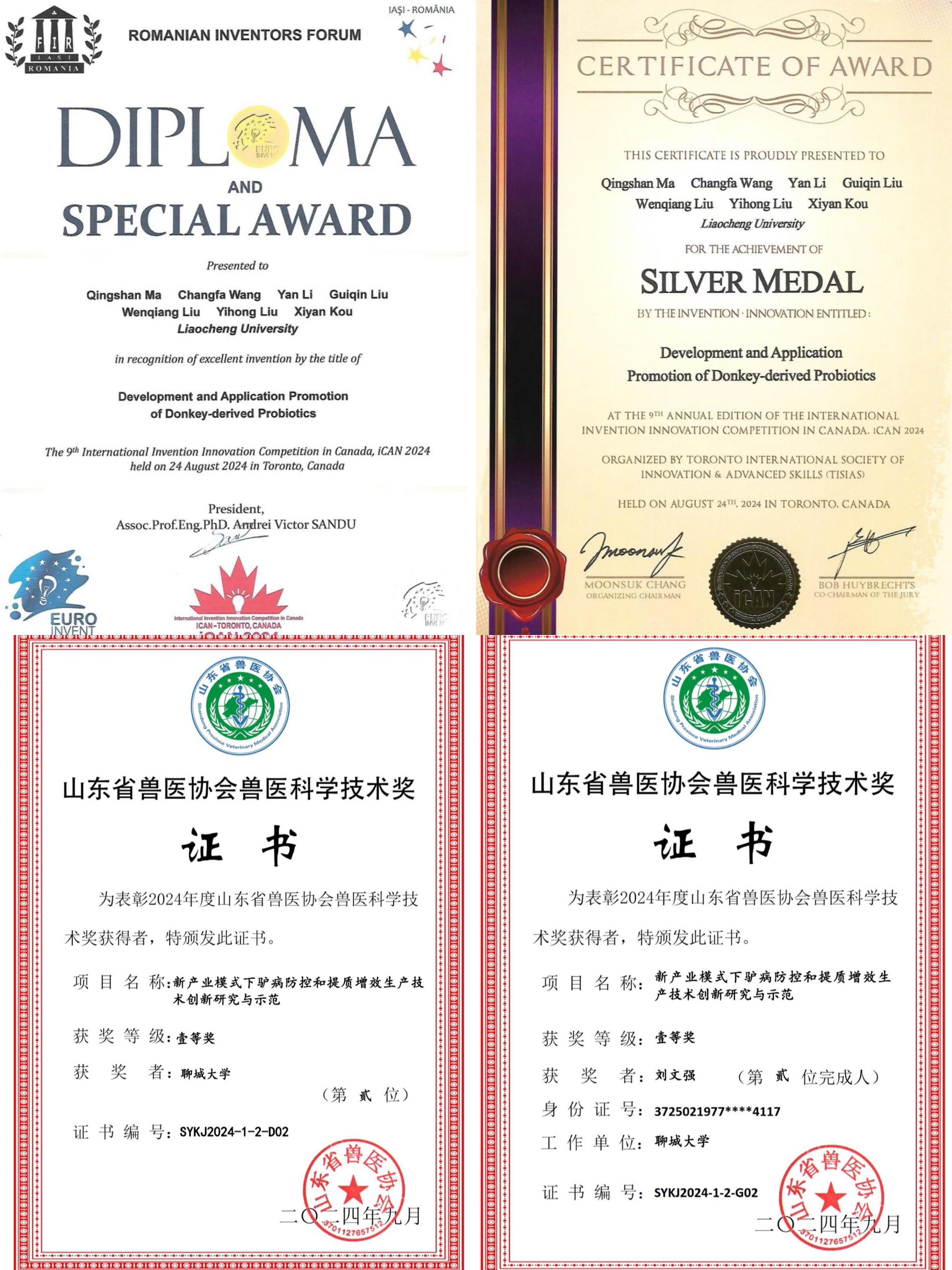 近日,beat365农业与生物学院驴科学研究团队两项科研成果分别获第九届加拿大国际发明创新大赛(iCAN)银奖及国际特别奖和2024年度山东省兽医协会兽医科学技术奖一等奖。