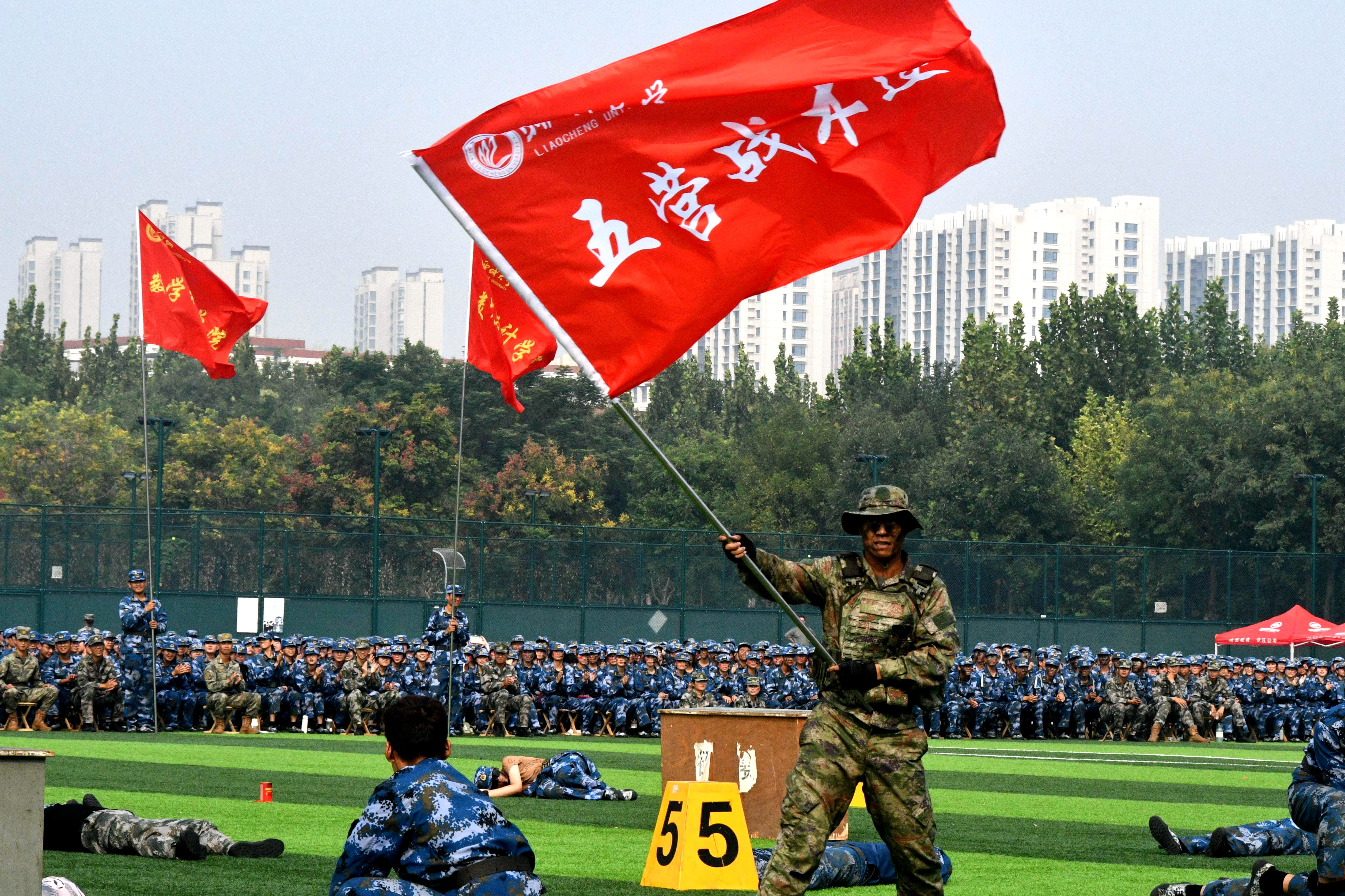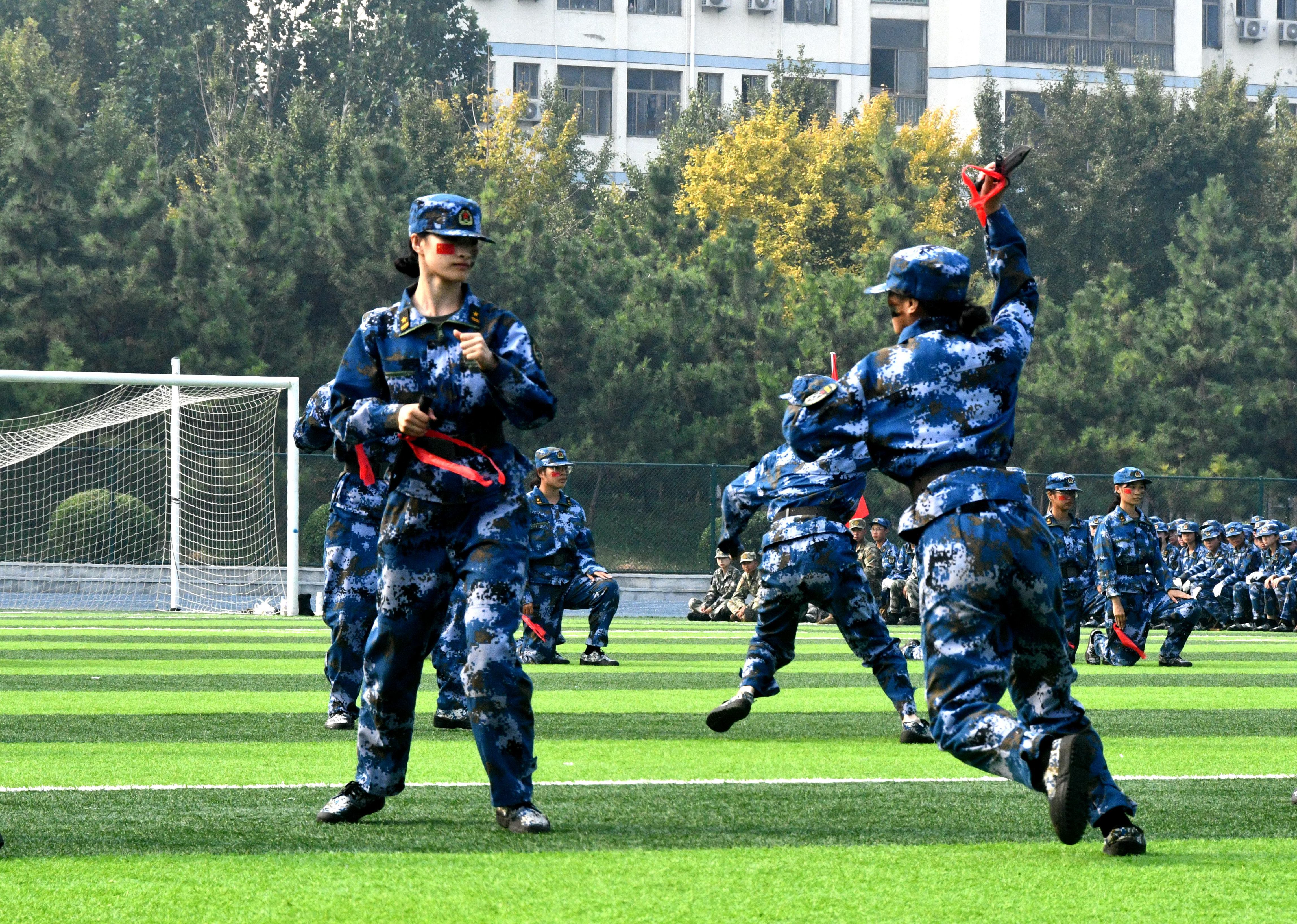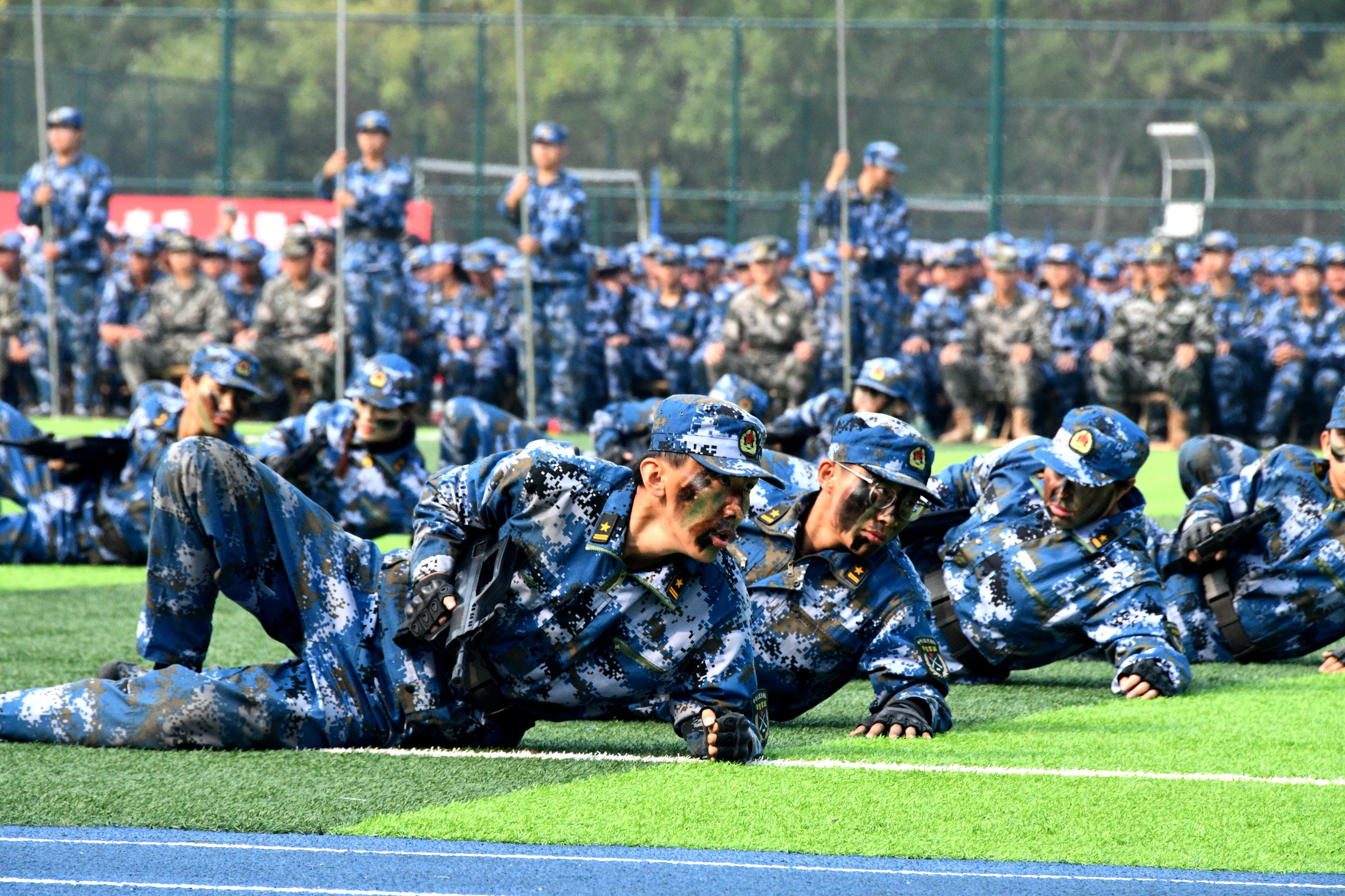伴随着国歌雄壮激昂的旋律,鲜艳的五星红旗冉冉升起,迎风飘扬,军训总结大会拉开序幕。随后,各方队先后进行了军训队列展示、作风养成、刺杀操、捕俘拳、匕首操、战术演练等军事技能训练科目汇报表演。新生们动作利落、队伍整齐、口号雄壮、精神饱满、声音嘹亮,赢得了阵阵掌声。