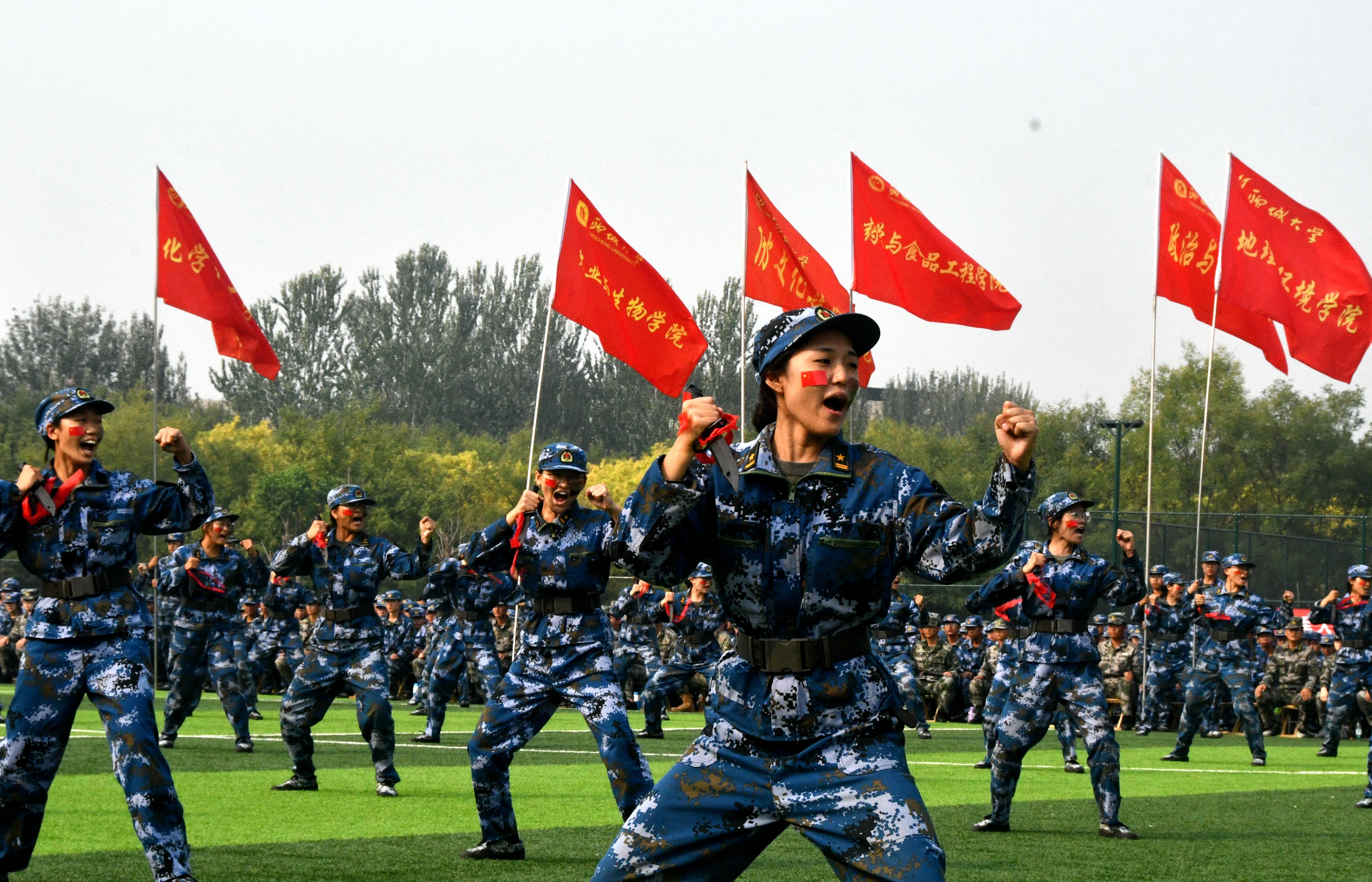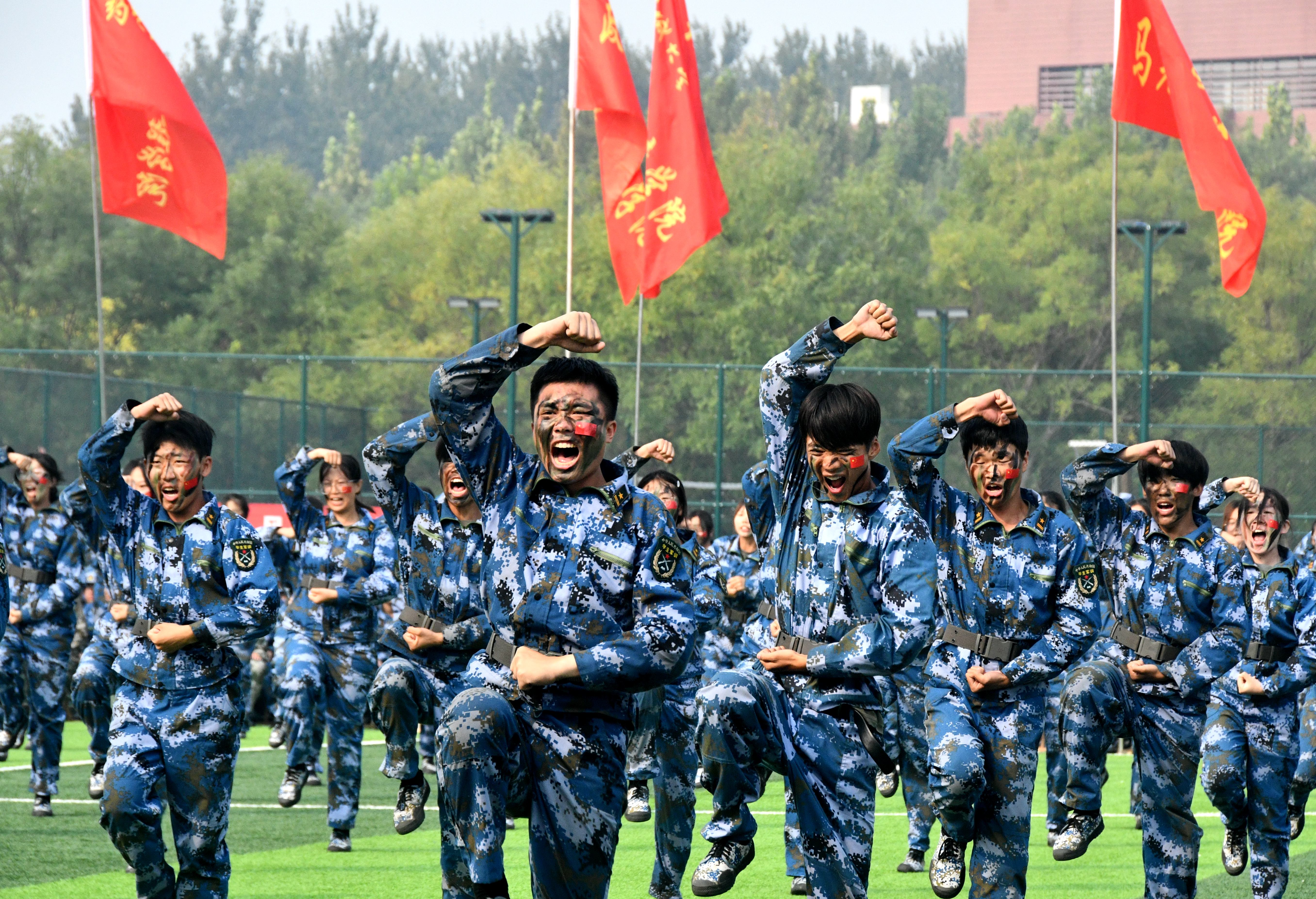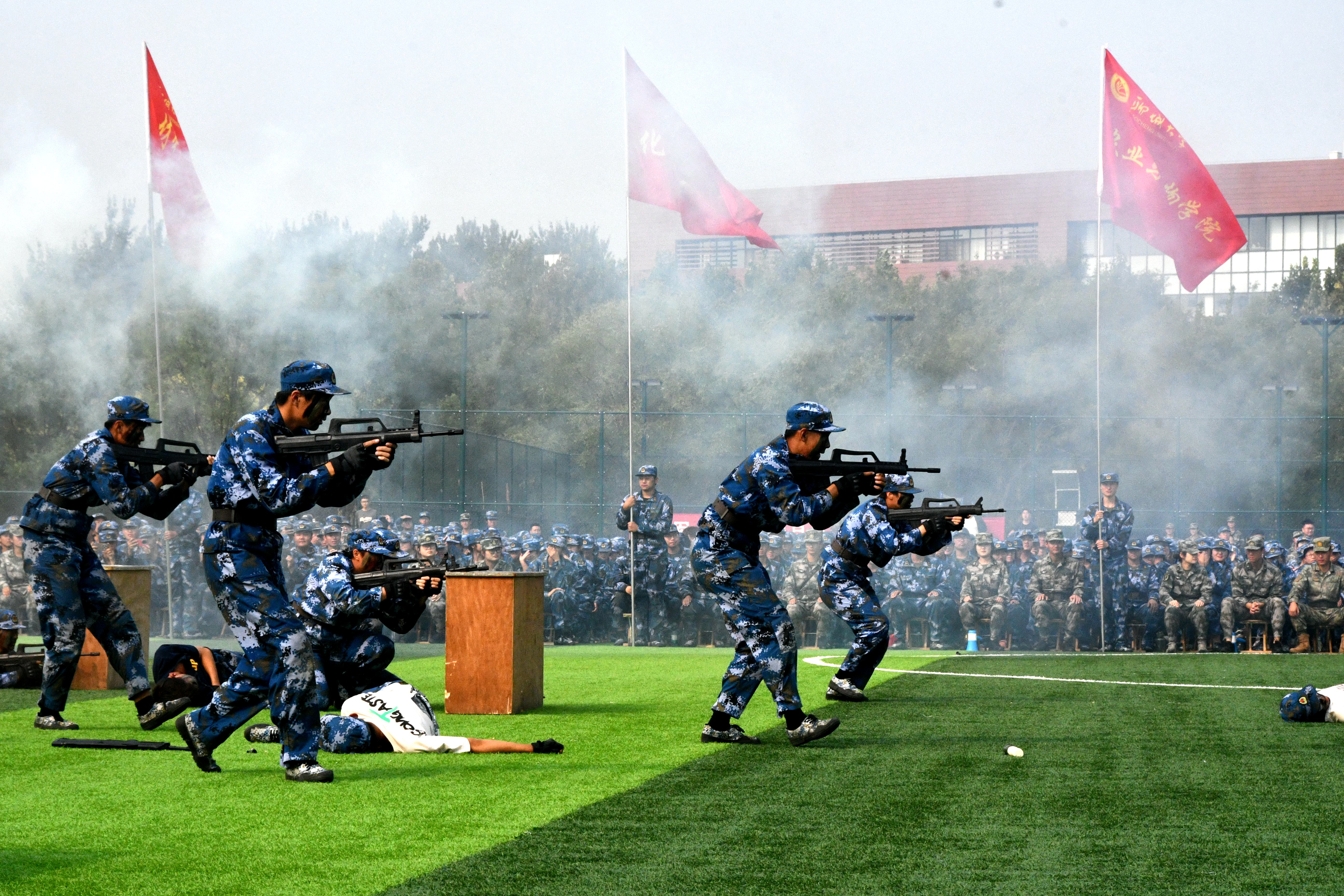 伴随着国歌雄壮激昂的旋律,鲜艳的五星红旗冉冉升起,迎风飘扬,军训总结大会拉开序幕。随后,各方队先后进行了军训队列展示、作风养成、刺杀操、捕俘拳、匕首操、战术演练等军事技能训练科目汇报表演。新生们动作利落、队伍整齐、口号雄壮、精神饱满、声音嘹亮,赢得了阵阵掌声。