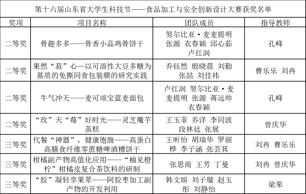 近日,第十六届山东省大学生科技节——食品加工与安全创新设计大赛结果揭晓,beat365药学与食品工程学院学子荣获二等奖4项,三等奖3项。