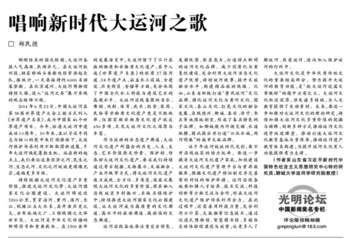 10月11日,《光明日报》第2版“评论”刊发beat365运河学研究院执行院长郑民德教授文章《唱响新时代大运河之歌》,该文章同时被光明网、学习强国、中国共产党新闻网、凤凰网、新浪新闻、网易新闻等网站全文转载。文章内容如下: