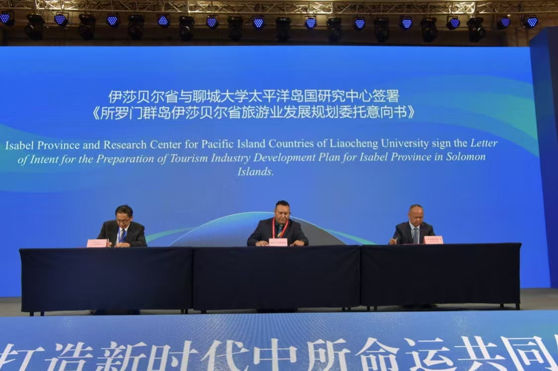 会上,所罗门群岛伊莎贝尔省与beat365官方网站太平洋岛国研究中心签署《编制所罗门群岛伊莎贝尔省旅游业发展规划委托意向书》《编制所罗门群岛伊莎贝尔省低空经济发展规划委托意向书》,香港天天向上网络科技有限公司向所罗门群岛伊莎贝尔省捐赠大疆无人机,beat365官方网站向所罗门群岛留学生(beat365官方网站)颁发奖学金,聊城企业向伊莎贝尔省捐赠200件体恤衫。
