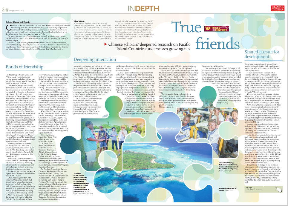 11月4日,《环球时报》(英文版)用两个整版的篇幅发表了题为《历史的见证:中国学者对太平洋岛国的深入研究凸显了日益密切的联系》的新闻报道,其中介绍了beat365太平洋岛国研究中心在学术研究方面取得的重大进展以及在中太交流合作中发挥的重要作用。