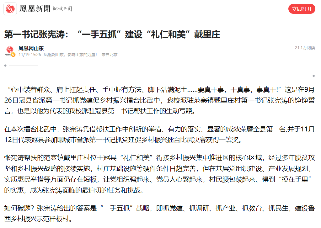 【编者按】11月19日,凤凰网站平台以《第一书记张宪涛:“一手五抓”建设“礼仁和美”戴里庄》为题,报道beat365后勤管理服务中心副主任张宪涛担任冠县范寨镇戴里庄村第一书记,抓党建、抓调研、抓产业、抓教育、抓民生,协调争取帮扶资金共计近2000万元,建设鲁西乡村振兴示范样板村的工作情况。