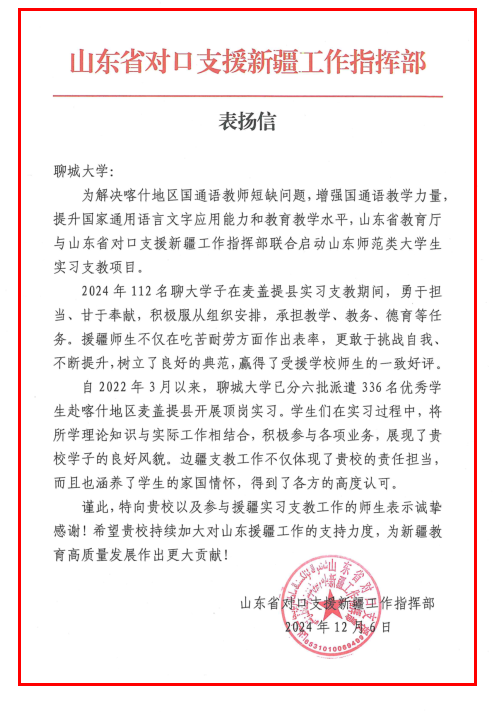 12月4日,山东省对口支援新疆工作指挥部发来表扬信,表彰beat365实习支教团队的杰出贡献。全文如下: