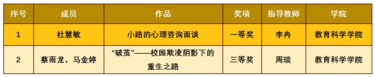 杜慧敏同学的心理咨询/心理治疗面谈组作品《小路的心理咨询面谈》经过层层选拔,最终脱颖而出,代表学校参加了全国总决赛。在决赛中,杜慧敏同学展现了扎实的专业知识和出色的实践能力,凭借对来访者问题的精准把握和个案概念化的能力,赢得评委的高度评价,最终荣获大赛一等奖。蔡雨龙和马金婷同学组成的团队在应用心理案例比赛中同样表现优异,展现了其在应用心理学领域的深刻理解和协作能力,最终荣获全国三等奖。