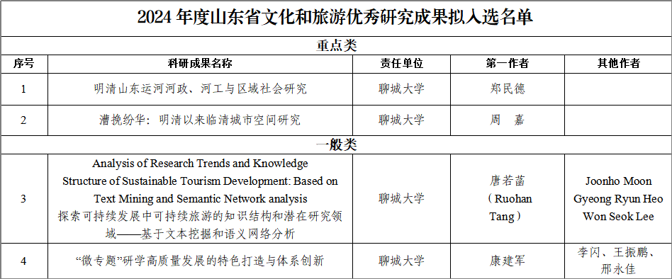 其中运河学研究院郑民德教授的《明清山东运河河政、河工与区域社会研究》、周嘉副教授的《漕挽纷华:明清以来临清城市空间研究》获重点类优秀研究成果,历史文化与旅游学院唐若菡博士的《Analysis of Research Trends and Knowledge Structure of Sustainable Tourism Development: Based on Text Mining and Semantic Network analysis探索可持续发展中可持续旅游的知识结构和潜在研究领域——基于文本挖掘和语义网络分析》、地理与环境学院康建军副教授的《“微专题”研学高质量发展的特色打造与体系创新》获一般类优秀研究成果。