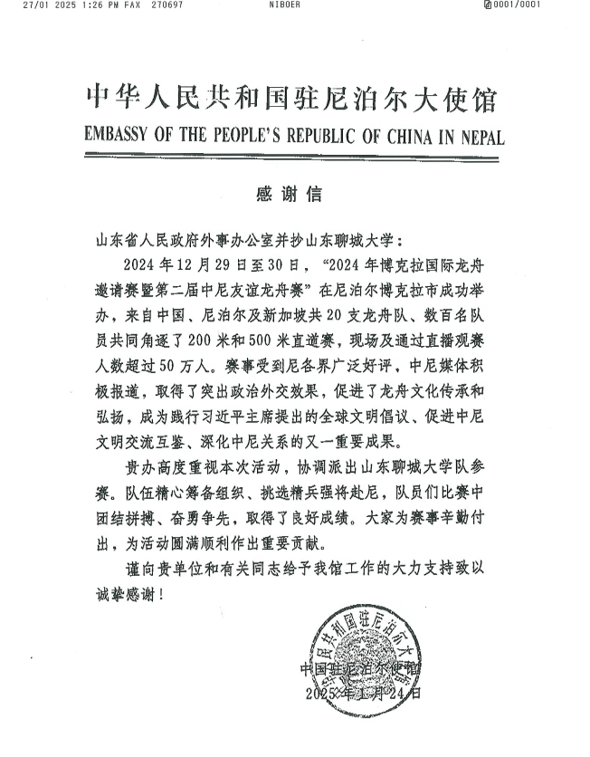 近日,山东省人民政府外事办公室转来中华人民共和国驻尼泊尔大使馆的感谢信,盛赞了beat365龙舟队在赴尼泊尔参加2024年博克拉国际龙舟邀请赛暨第二届中尼友谊龙舟赛期间的突出表现,对学校给予使馆工作的大力支持表示了感谢。