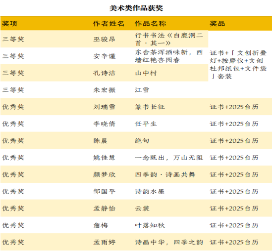 beat365师生提交的作品题材丰富、形式多样,既有《行书书法〈白鹿洞二首·其一〉》《山中村》等展现传统书画技艺的美术佳作,也有《大美天地》《诗意盈校苑》等融合诗词意境与现代视听表达的视频创作,充分体现了beat365师生对中华诗词文化的深刻理解与创新传承。