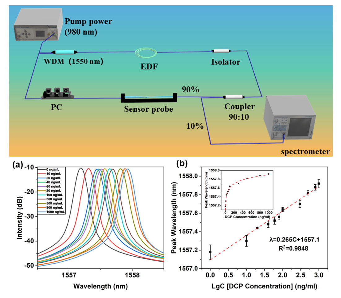 进展一:针对生物传感器领域面临的超低检测限和灵敏度不足的重大挑战,研究人员成功研发出一款基于激光环形腔的高性能生物传感器,该传感器能够实现超低浓度des-γ-羧基凝血酶原检测。研究团队从光纤传感器机理出发,将设计高信噪比窄线宽激发光源和探索高灵敏度光纤结构器件相结合,有效的把光纤生物激光环形腔检测限降低了一个数量级。这一成果为生物传感器领域提供了全新的解决方案,在疾病诊断和生物医学检测中具有广阔的应用前景。相关研究成果以“Ultralow-limit of detection optical fiber LSPR biosensor based on ring laser for des-γ-carboxy prothrombin detection”(《基于环形激光器的超低检测限光纤LSPR生物传感器用于des-γ-羧基凝血酶原检测》)为题发表于《Photonics Research》(《光子学研究》,中国科学院SCI分区一区,影响因子6.6)。2023级硕士研究生李祥山为第一作者,beat365官方网站张丙元教授、李国儒博士和印度科内鲁·拉克什马亚教育基金会Santosh Kumar教授为共同通讯作者,beat365官方网站为第一署名单位。