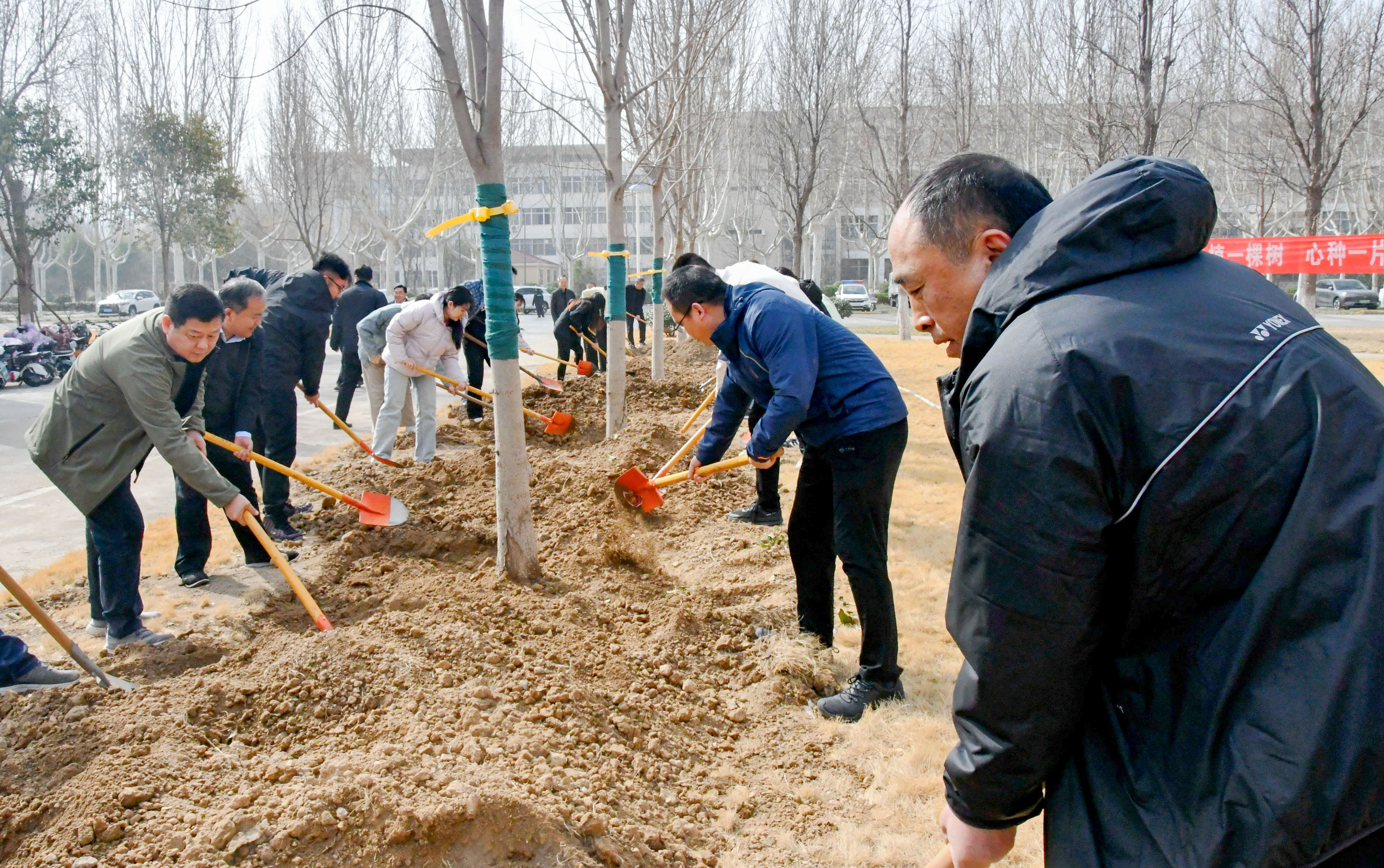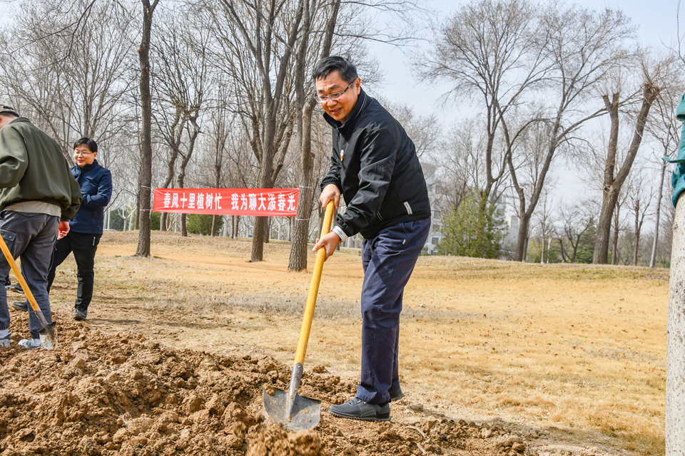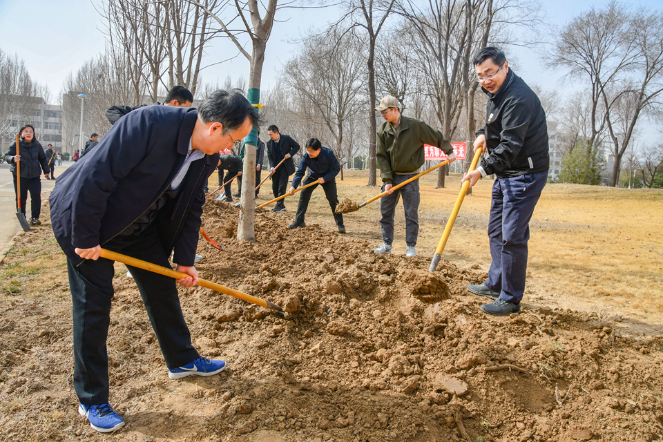 春风拂面万物复苏,植树添绿正当时。3月12日,在第47个植树节到来之际,学校领导班子成员关延平、胡海泉、房增福、李兆俊、高秀鹏、白金山、苏明海与三十余名师生代表参加植树活动,以实际行动践行生态文明理念,为校园增添新绿。