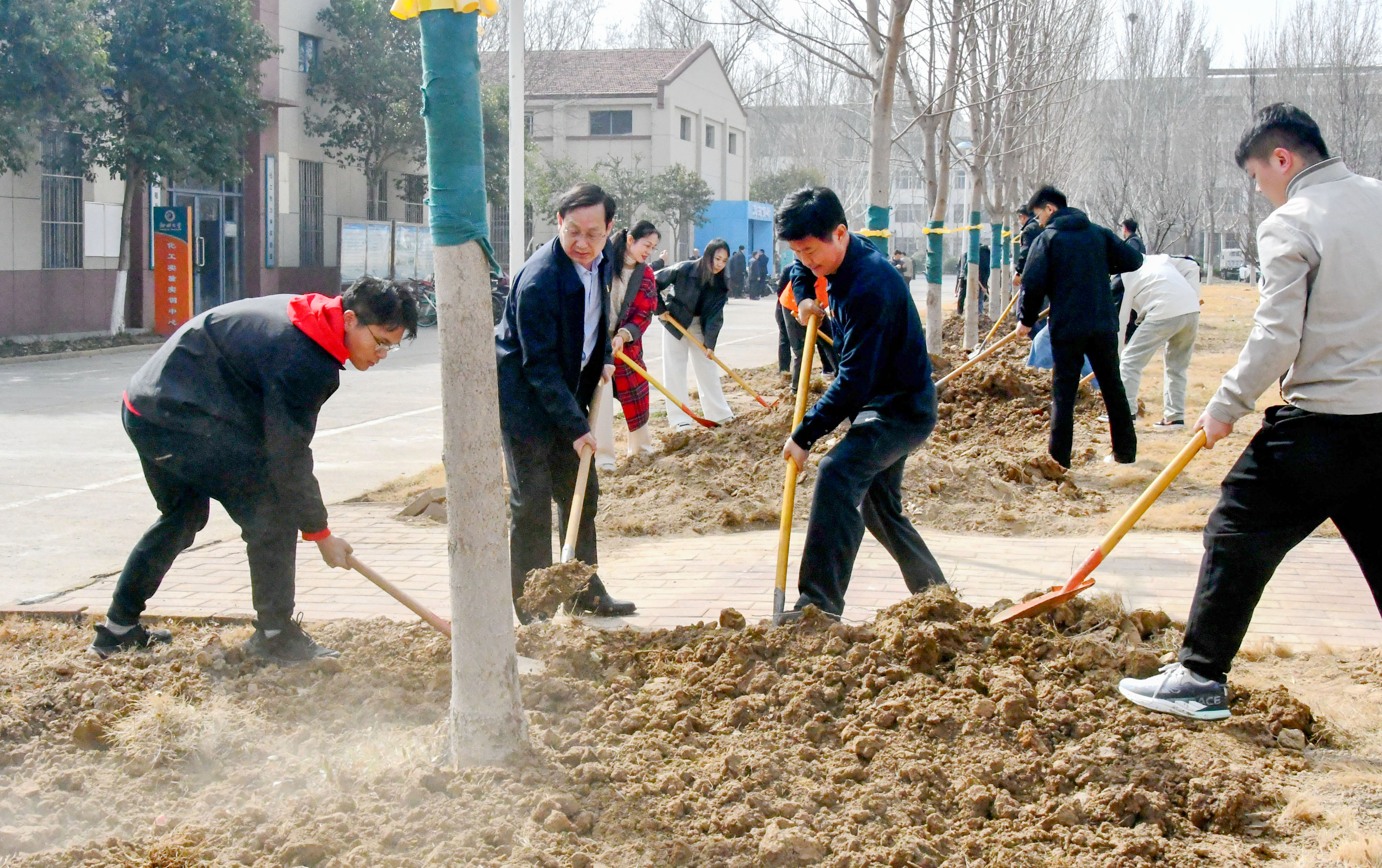 上午10时,校领导与师生们热情高涨地投入劳动。大家分工协作、默契配合,挥锹铲土、踩实压紧……大家干劲十足。植树间隙,校领导与青年学子亲切交流,鼓励同学们要像小树一样扎根厚土、向阳生长。
