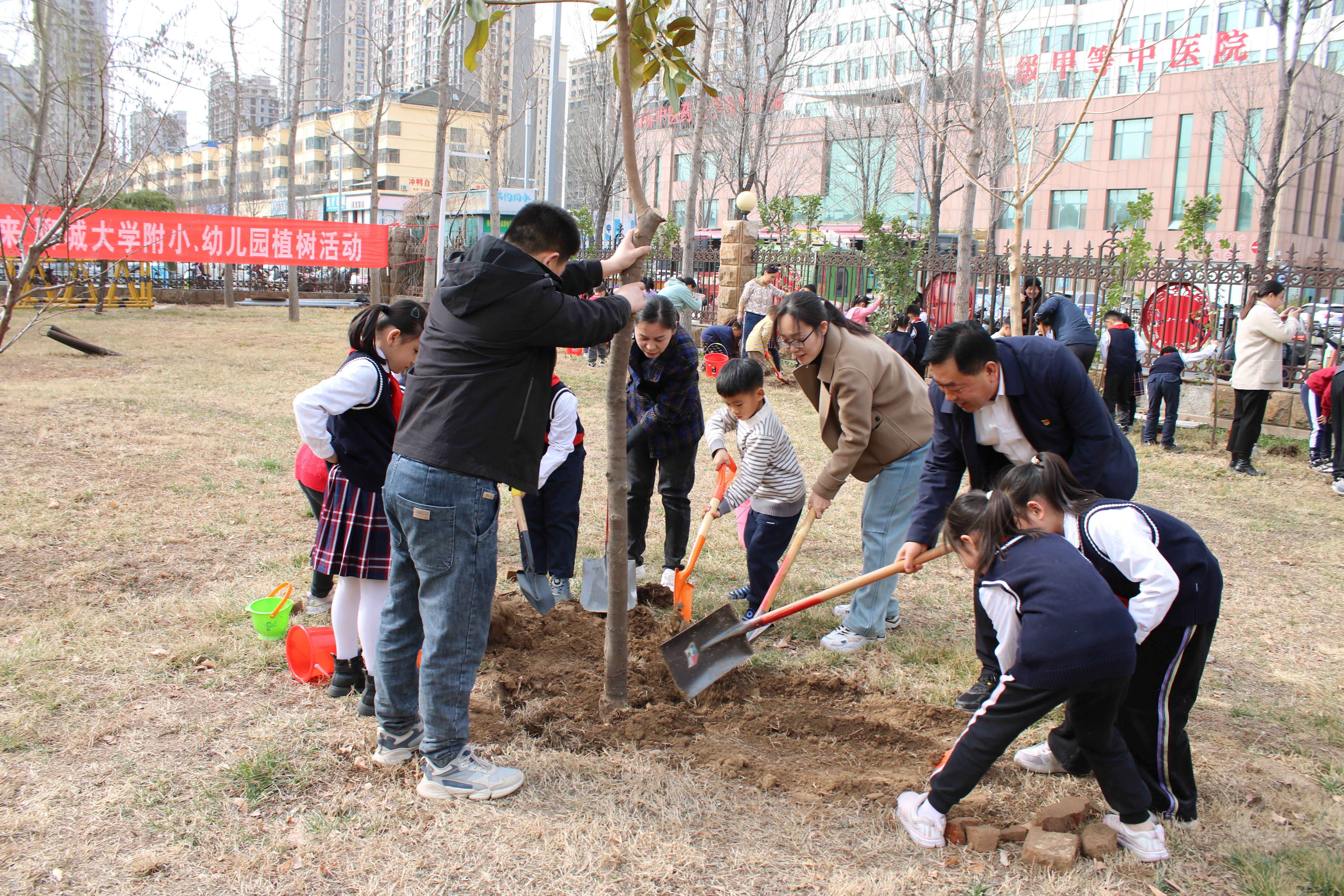 当天下午,党委常委、副校长李兆俊和附属小学、幼儿园的师生们一起开展“种植希望,培育未来”主题植树活动。