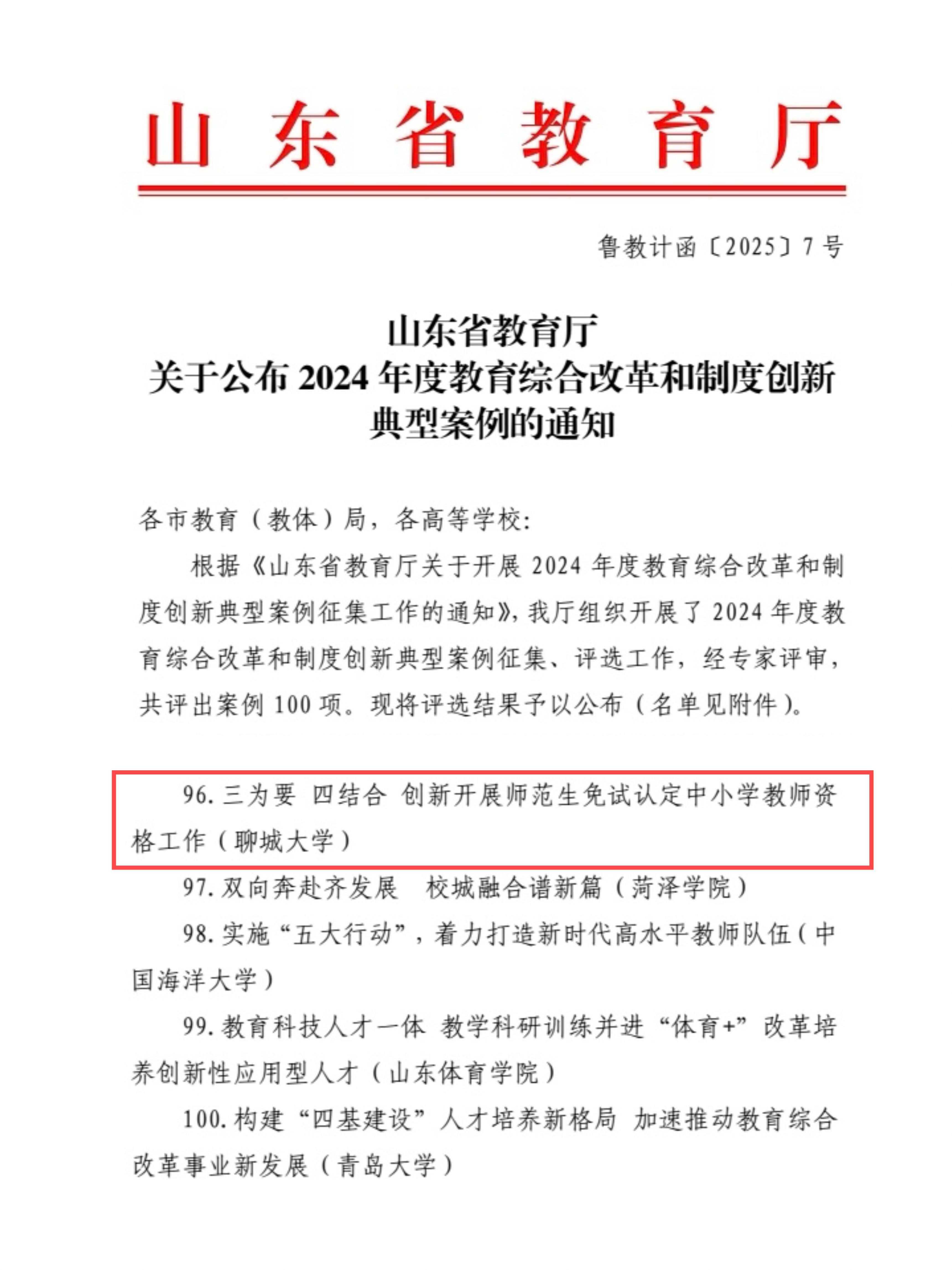 近日,山东省教育厅公布 2024 年度教育综合改革和制度创新典型案例的,beat365报送的案例《三为要 四结合 beat365官方网站创新开展师范生免试认定中小学教师资格工作》 成功入选。