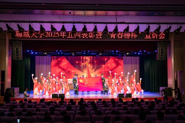 红旗团支部标兵、传媒技术学院2022级广播电视编导5班团支部朗诵《百年薪火 聊传新篇》,深情讲述了团支部成员以镜头为笔、以光影为墨,在思想引领、社会实践等方面的努力与成效。情境歌舞《有我》展现着聊大青年用行动践行“请党放心 强国有我”的青春风貌。