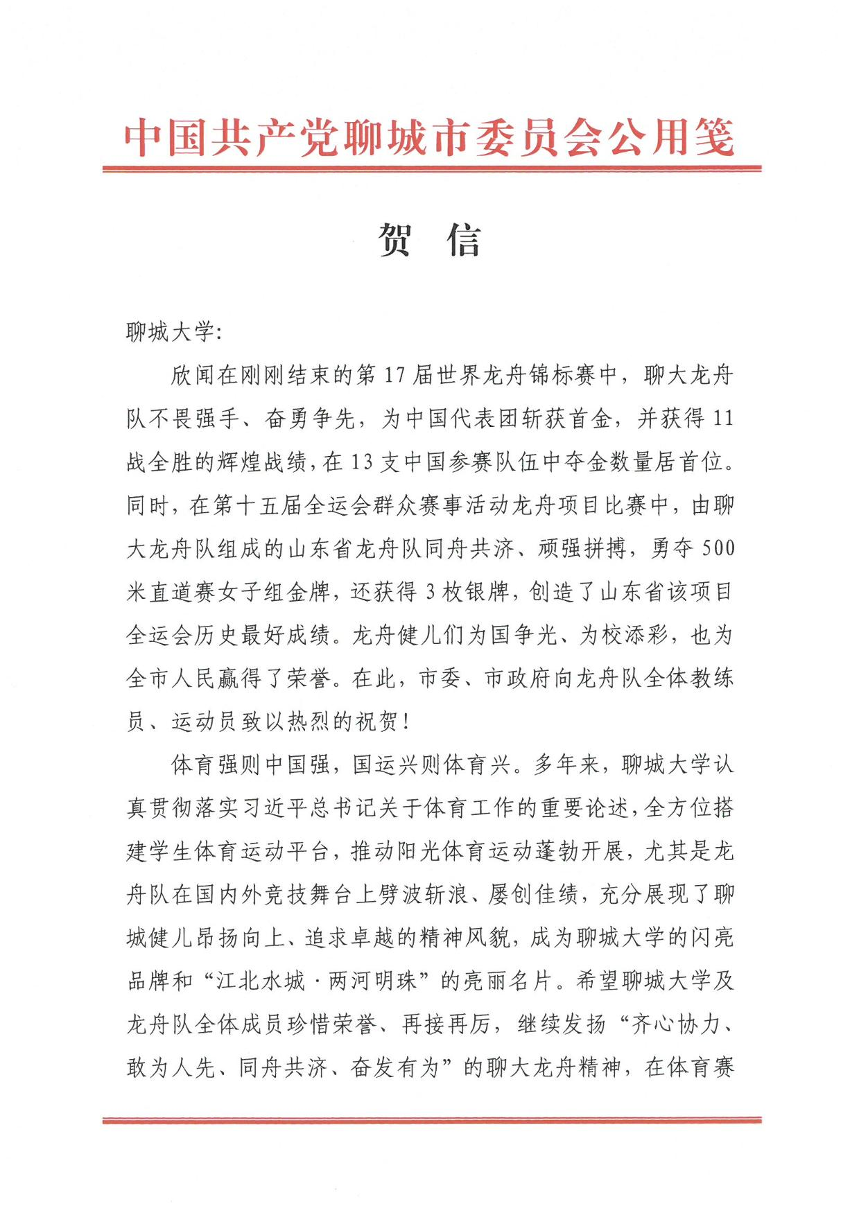 欣闻在刚刚结束的第17届世界龙舟锦标赛中,聊大龙舟队不畏强手、奋勇争先,为中国代表团斩获首金,并获得11战全胜的辉煌战绩,在13支中国参赛队伍中夺金数量居首位。同时,在第十五届全运会群众赛事活动龙舟项目比赛中,由聊大龙舟队组成的山东省龙舟队同舟共济、顽强拼搏,勇夺500米直道赛女子组金牌,还获得3枚银牌,创造了山东省该项目全运会历史最好成绩。龙舟健儿们为国争光、为校添彩,也为全市人民赢得了荣誉。在此,市委、市政府向龙舟队全体教练员、运动员致以热烈的祝贺!