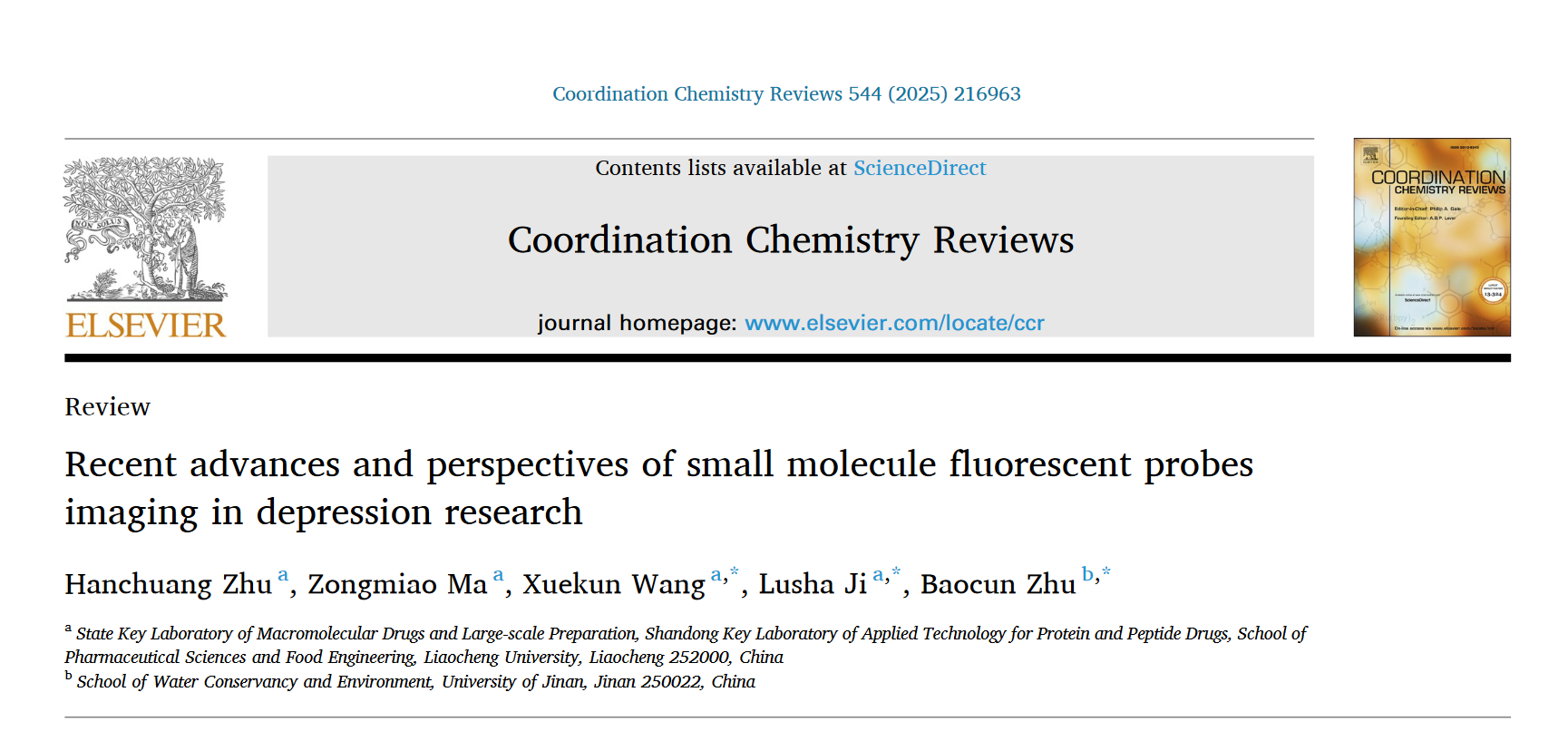 近日,beat365重大疾病治疗药物靶点研发团队在生物与医药领域国际顶级期刊《配位化学评论》( Coordination Chemistry Reviews )(中科院一区,影响因子23.5)发表题为《小分子荧光探针成像在抑郁症研究中的最新进展与展望》( Recent advances and perspectives of small molecule fluorescent probes imaging in depression research )的综述论文。该研究系统总结了小分子荧光探针技术在抑郁症机制研究与临床诊疗中的前沿进展,为推动小分子荧光探针技术在抑郁症精准诊断中的临床转化应用提供了重要理论支持。