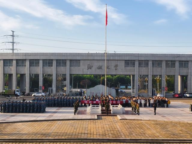2024级学生代表集体朗诵《擎旗祭先烈,奋进新征程》。在饱含深情的朗诵声中,在场师生深切缅怀杨靖宇、赵一曼等革命先烈为民族独立浴血奋战的英勇精神,深刻理解“两弹一星”精神、“北斗组网”凝聚的爱国情怀。2025级十连全体成员整齐列队,合唱《强军战歌》。歌声铿锵有力、节奏昂扬,展现出青年学子的蓬勃朝气,更传递出铭记历史、挺膺担当的强烈信念。