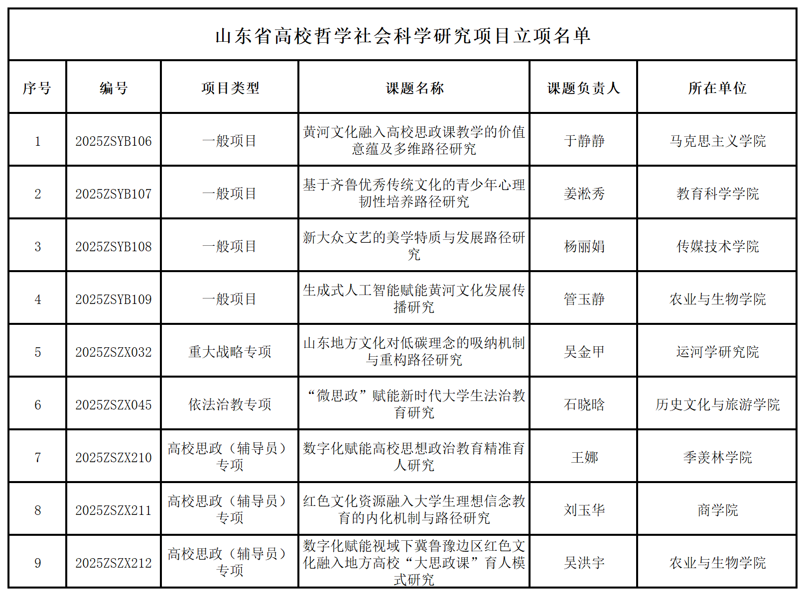 近日,山东省教育厅发布山东省高等学校哲学社会科学研究项目立项名单,beat365获批9项,立项率70%。其中,农业与生物学院获批2项,马克思主义学院、教育科学学院、传媒技术学院、运河学研究院、历史文化与旅游学院、季羡林学院、商学院各获批1项。