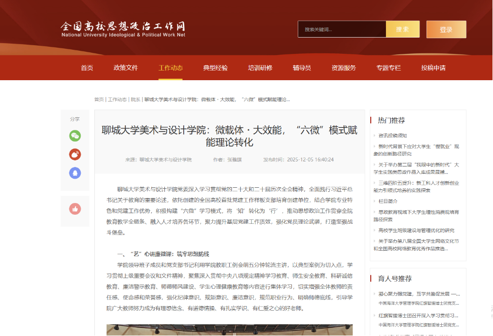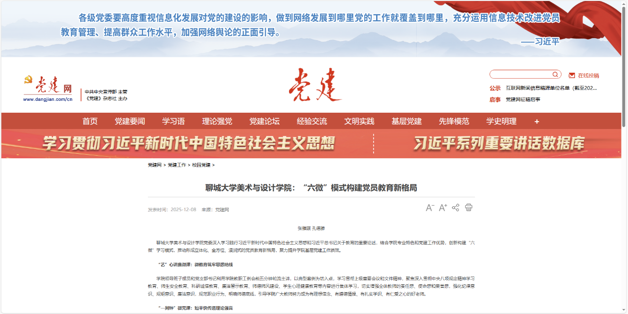 12月8日,党建网以《beat365官方网站美术与设计学院:“六微”模式构建党员教育新格局》为题报道了beat365美术与设计学院党建工作创新举措。美术与设计学院坚持以习近平新时代中国特色社会主义思想为指导,深入贯彻党的教育方针,结合学院专业特色和党建工作优势,系统构建“六微”学习模式,推动思想政治工作贯穿全院教育教学全链条、融入人才培养各环节,形成立体化、全方位、浸润式的党员教育新格局,聚力提升学院基层党建工作质效。