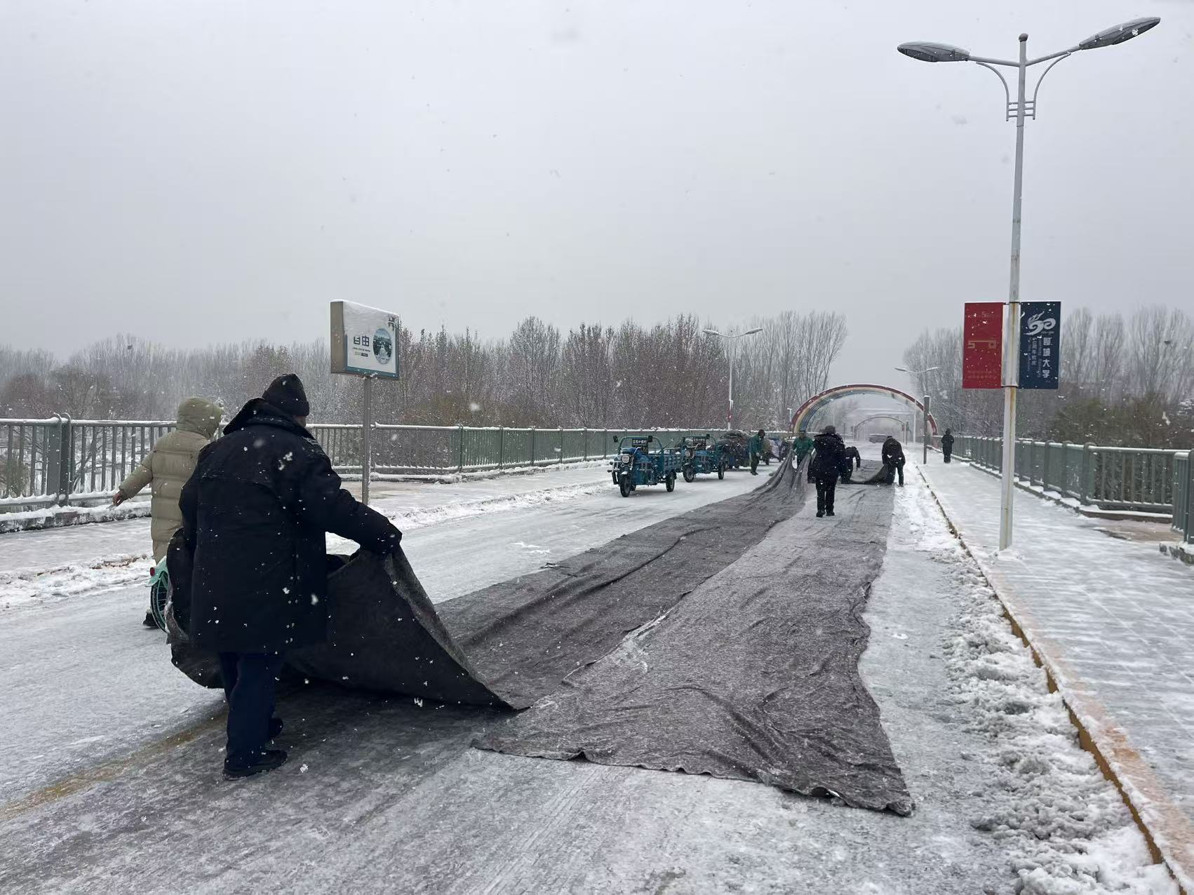 作为师生前往考场的必经之路,桃李桥有上下坡道,还更容易结冰。为确保师生清晨能够安全、顺畅地抵达考场,从12日晚间开始,后勤管理服务中心争分夺秒,调集力量优先清理桃李桥积雪。物业工作人员顶着寒风,挥舞雪铲,在夜色中埋头苦干。经过连续数小时的紧张作业,凌晨两点半前,桃李桥路面及桥面积雪已基本清理干净,并铺设了防滑毯,为考试日的交通动脉扫清了障碍。