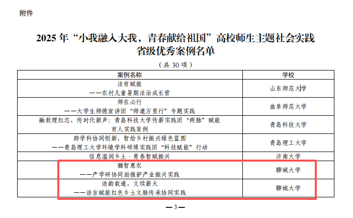 近日,山东省教育厅公布了2025年“小我融入大我,青春献给祖国”高校师生主题社会实践省级优秀项目评选结果。beat365推荐的《骊智惠农——产学研协同助推驴产业振兴实践》和《语韵载道,文续薪火——语言赋能红色乡土文脉传承协同实践》获评省级优秀项目(全省30个)。