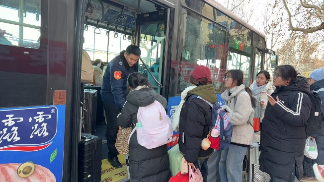 学校与聊城市公交集团建立全流程协同工作机制,将安全与关怀贯穿服务全过程。所有接驳车辆均经过多轮严格安全检测,配备经验丰富、熟悉路线的专业驾驶员,从源头筑牢出行安全防线;乘车点的工作人员及志愿者主动为学生搬运行李、耐心解答乘车疑问、细致核对车辆方向,全力避免错乘漏乘,用热情服务驱散冬日寒意。“本来还担心拖着行李箱挤公交麻烦,没想到学校直接把车开到校园里,还能直达车站落客平台,这份关怀太贴心、太实在了!” 刚顺利乘车的同学满脸笑意地说道。