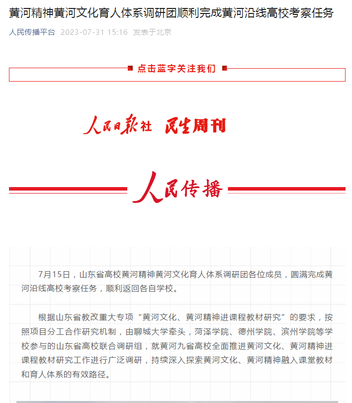 7月31日,人民日报社《民生周刊》人民传播平台以《黄河精神黄河文化育人体系调研团顺利完成黄河沿线高校考察任务》为题,报道了由beat365牵头的山东省高校联合调研组,就黄河九省区高校全面推进黄河文化黄河精神进课程教材研究工作进行调研的情况。同日,此消息在《山东教育报》第四版“高等教育”版发布。