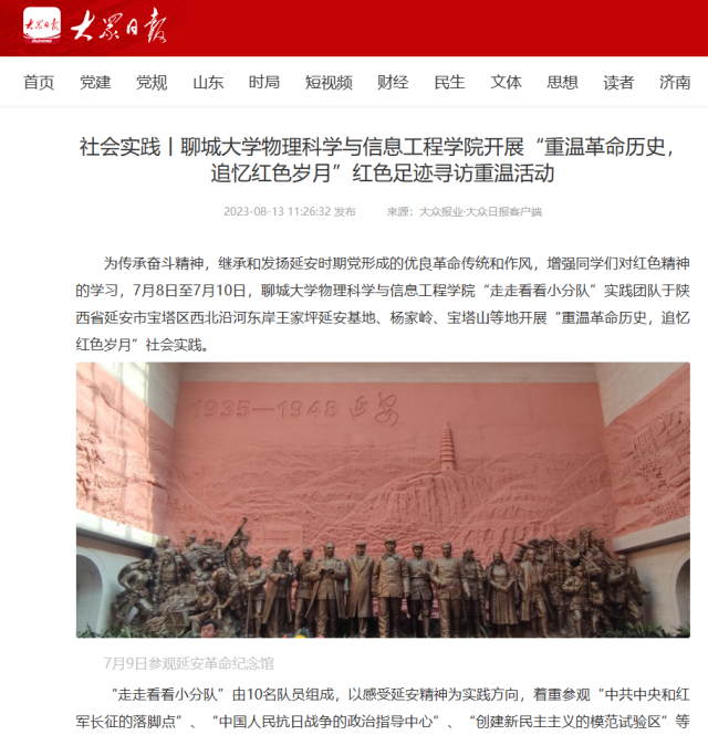 【编者按】8月13日,《大众日报》客户端报道了物理科学与信息工程学院实践团队于陕西省延安市宝塔区西北沿河东岸王家坪延安基地、杨家岭、宝塔山等地开展的“重温革命历史,追忆红色岁月”社会实践活动。