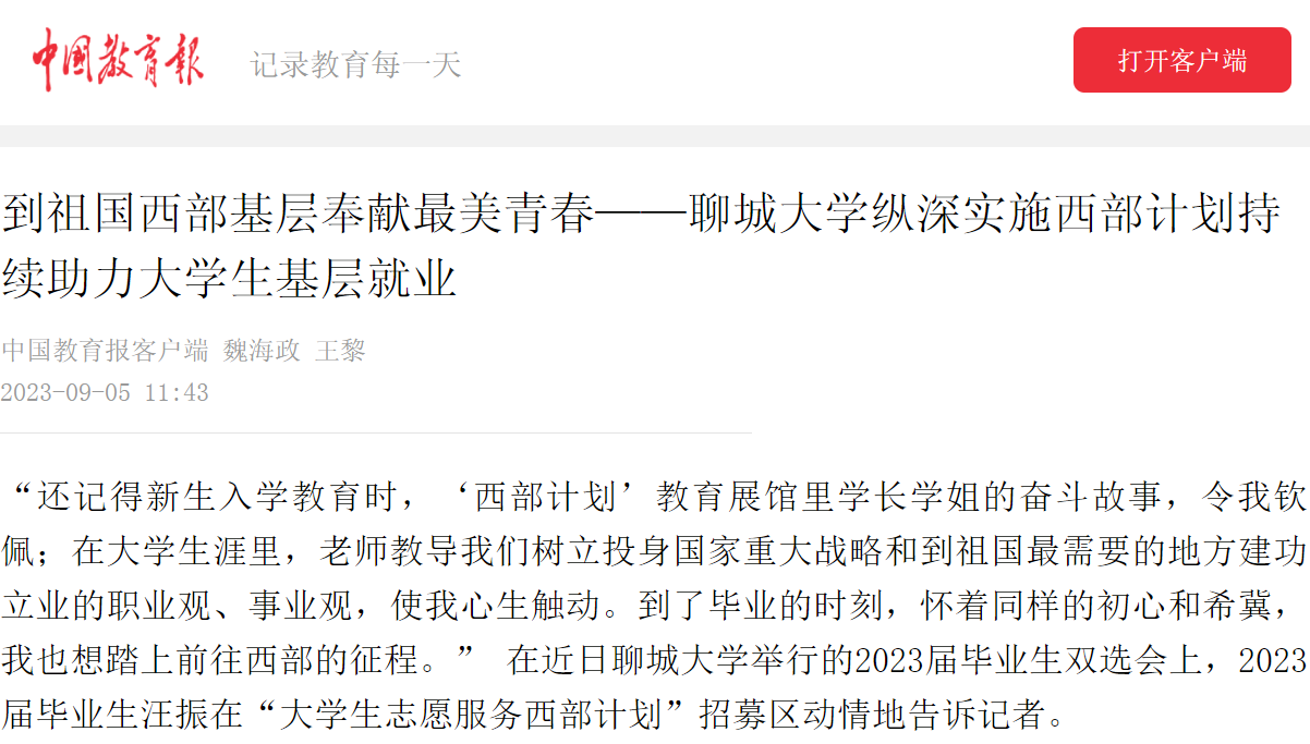 【编者按】9月5日,中国教育报(客户端)以《到祖国西部基层奉献最美青春——beat365官方网站纵深实施西部计划持续助力大学生基层就业》为题,报道beat365持续实施西部计划,助力大学生基层就业的工作经验和做法,鲜明展现了西部计划的“聊大现象”。
