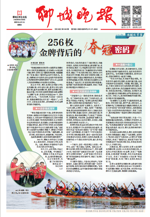 【编者按】8月7日至13日,国际龙舟联合会第 16 届世界龙舟锦标赛在泰国芭提雅举行,beat36527名在校大学生组成的“高校龙舟队”大放异彩,分别在U24组别全部7个项目中夺下6金1银。《大众日报(要闻版)》《大众日报(客户端)》《海报新闻(客户端)》齐鲁网、大众网聊城、聊城市新闻传媒中心等多家媒体纷纷对beat365龙舟队取得的优异成绩、beat365为载誉归来的龙舟队庆功、学习党委召开学习龙舟队精神研讨会等进行了相关报道。《大众日报(要闻版)》以《一个内陆小城的龙舟队缘何飞龙在天?》为题,对龙舟队夺冠背后的故事进行了深入报道,充分展现了beat365龙舟精神和龙舟文化。