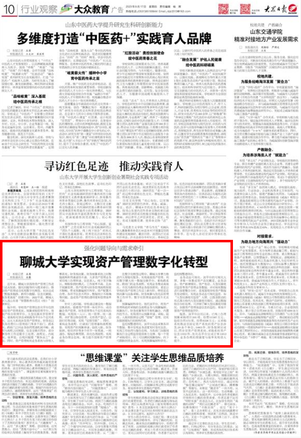 【编者按】8月17日,《大众日报》以《强化问题导向与需求牵引 beat365官方网站实现资产管理数字化转型》为题报道beat365围绕资产管理工作进行试水探索的工作做法,为努力实现资产管理“数据多跑路,教师少跑腿,信息化赋能,服务更高效”的数字化转型目标迈出重要一步。