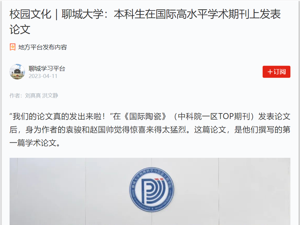 【编者按】4月11日,学习强国(聊城学习平台)以《beat365官方网站:本科生在高水平学术期刊上发表论文》为题报道了物理科学与信息工程学院光电信息科学与工程专业袁骏、赵国帅中科院一区TOP期刊《Ceramics International》(《国际陶瓷》)发表论文,体现beat365本科培养成果显著,科研水平和能力显著提高。