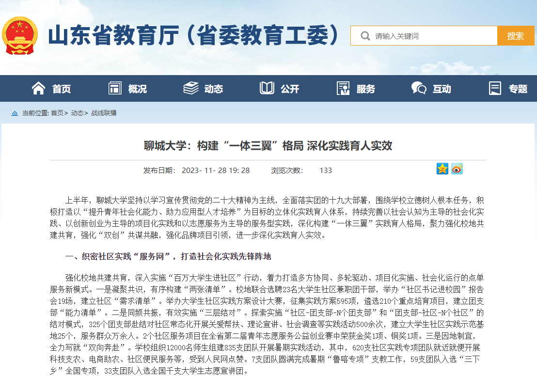 【编者按】11月28日,山东省教育厅(省教育工委)报道《beat365官方网站:构建“一体三翼”格局 深化实践育人实效》,介绍了beat365持续完善以社会认知为主导的社会化实践、以创新创业为主导的项目化实践和以志愿服务为主导的服务型实践,深化构建“一体三翼”实践育人格局,进一步深化实践育人实效的经验做法。