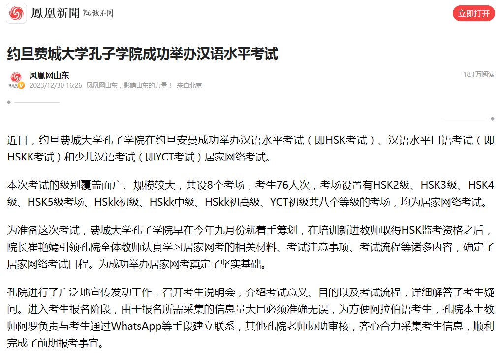 【编者按】2023年12月30日,凤凰网报道了约旦费城大学孔子学院在约旦安曼成功举办汉语水平考试的消息。
