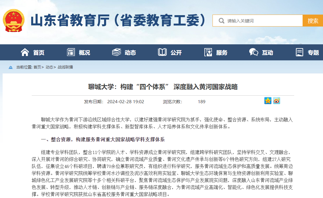 【编者按 】 2月28日,山东省教育厅(省教育工委)报道《beat365官方网站:构建“四个体系” 深度融入黄河国家战略》,介绍了beat365以建好建强黄河学研究院为抓手,强化使命、整合资源、系统布局,主动融入黄河重大国家战略,积极构建学科支撑体系、新型智库体系、人才培养体系和文化传承创新体系的经验做法。