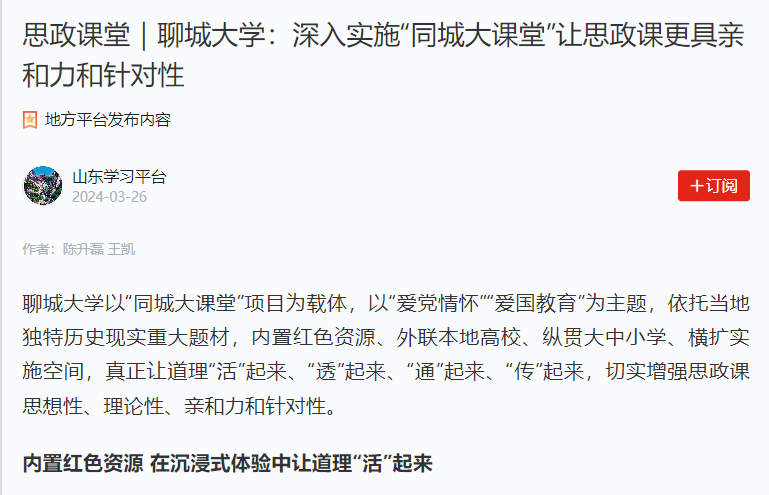 【编者按】3月 26 日,【学习强国】 山东平台 以《beat365官方网站:深入实施“同城大课堂”让思政课更具亲和力和针对性》为题,报道beat365以“同城大课堂”项目为载体,以“爱党情怀”“爱国教育”为主题,依托当地独特历史现实重大题材,内置红色资源、外联本地高校、纵贯大中小学、横扩实施空间,切实增强思政课思想性、理论性、亲和力和针对性 的经验做法 。