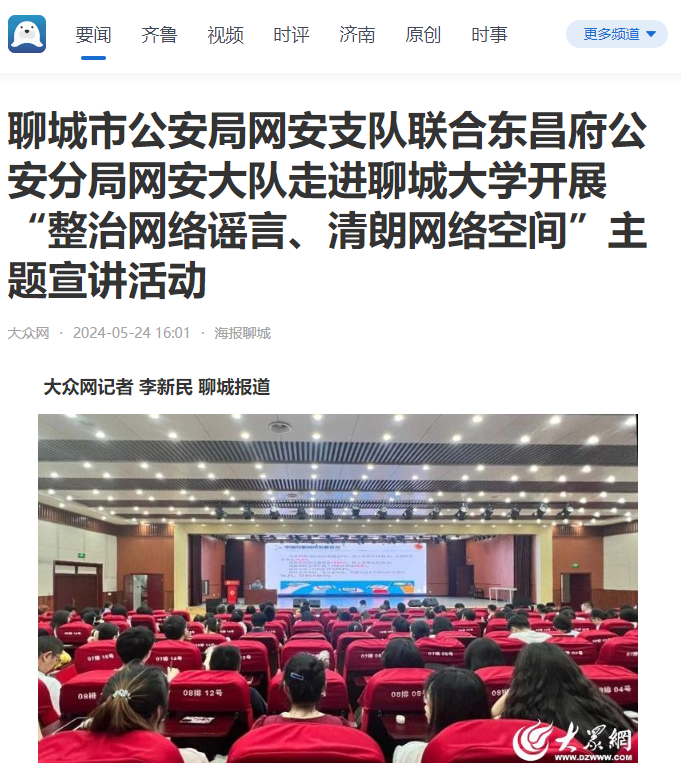 【大众网• 海报新闻】报道聊城市公安局网安支队联合东昌府公安分局网安大队走进beat365官方网站开展“整治网络谣言、清朗网络空间”主题宣讲活动